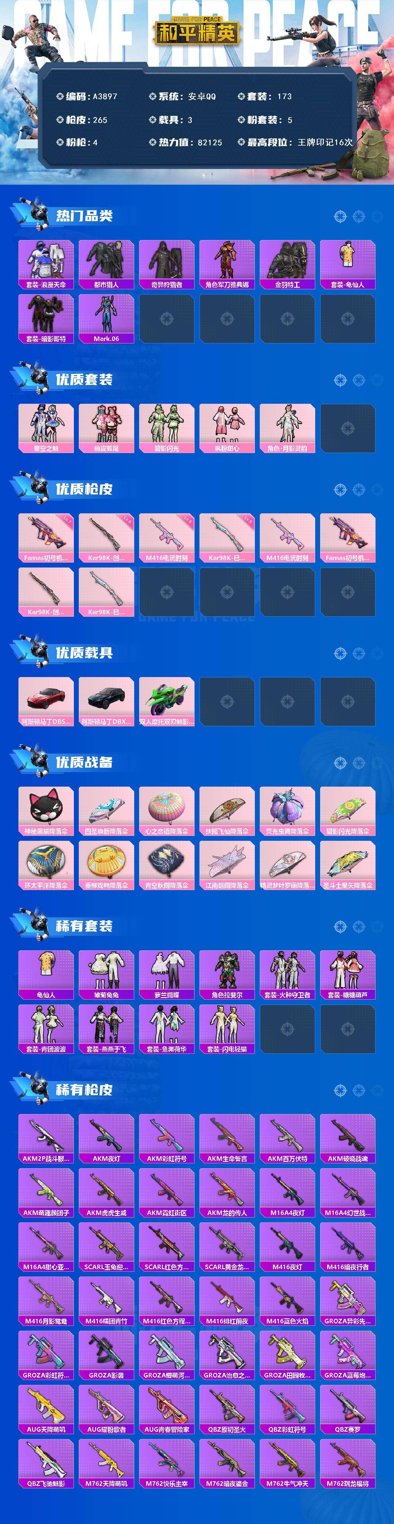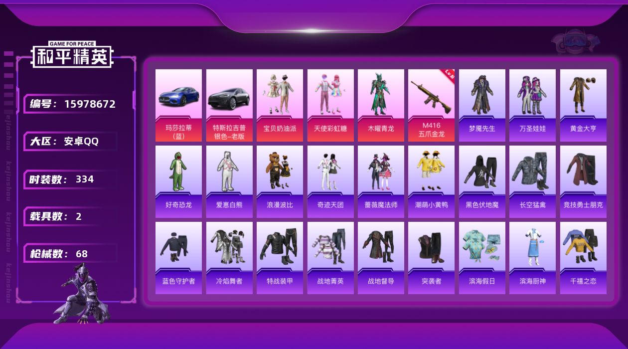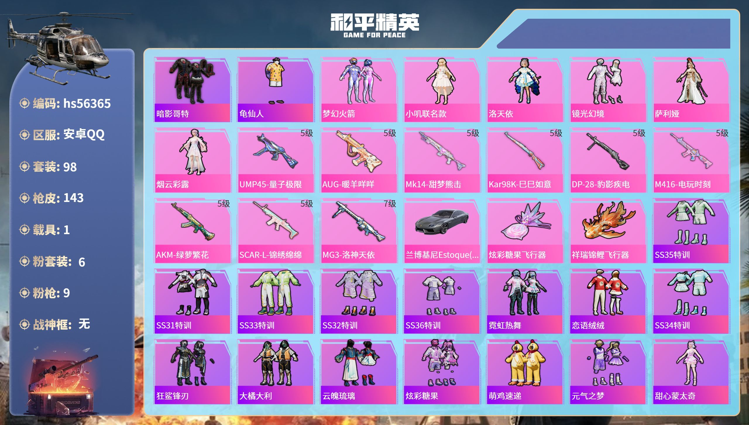 hs56365 安卓手Q-7王牌印记-6粉装-9特效枪-1载具-46099热力值-98套装-143枪