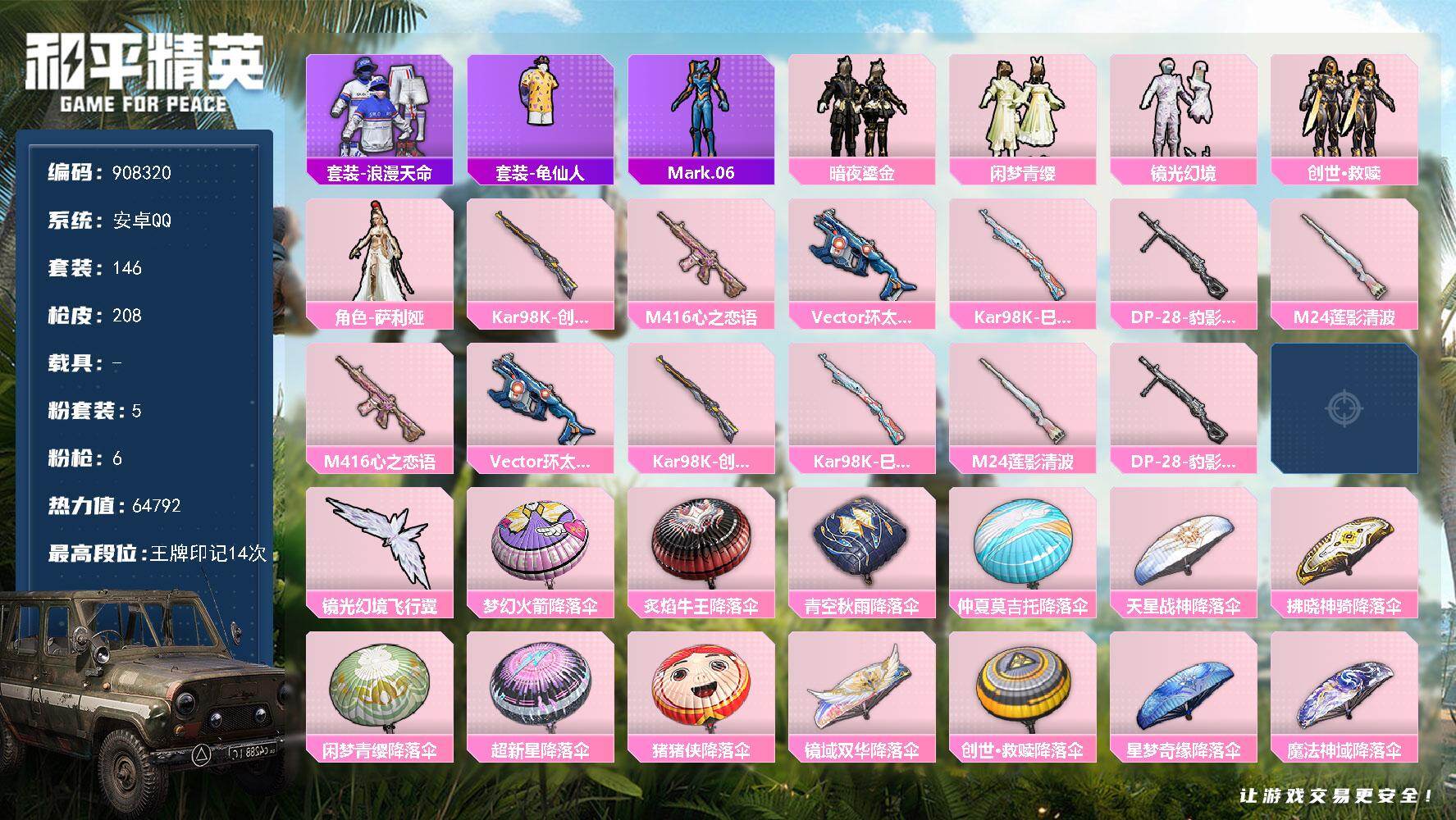 安卓QQ-【5206】6粉装-4特效枪-1载具-66614热力值-15印记-155套装-