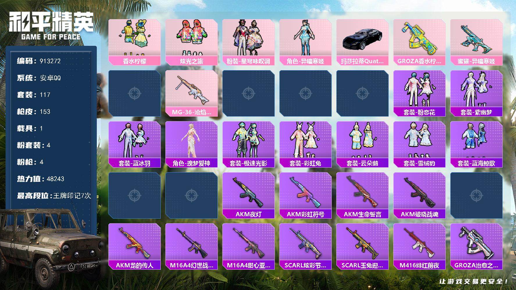 7王牌印记-有战神框-4粉装-4特效枪-1载具-48243热力值-117套装-153枪皮-2卓越印记-2传奇印记