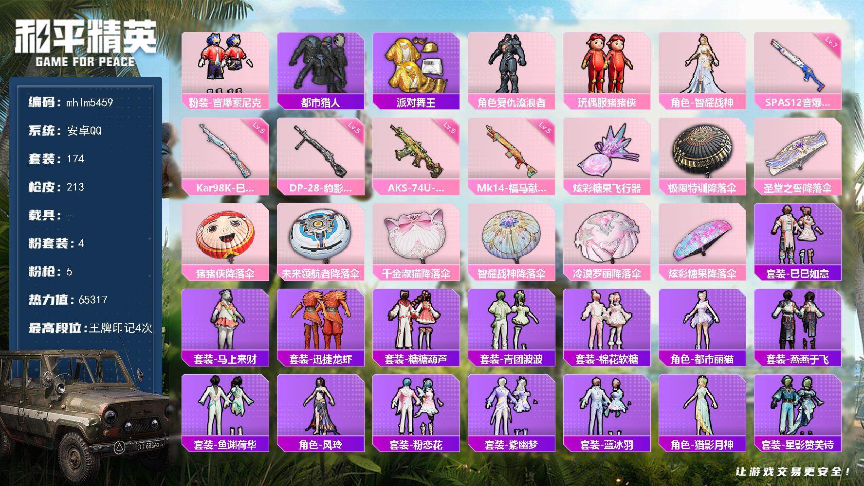 安卓 手Q-4粉装-5特效枪-0载具-1粉色飞行器-65317热力值-4王牌印记