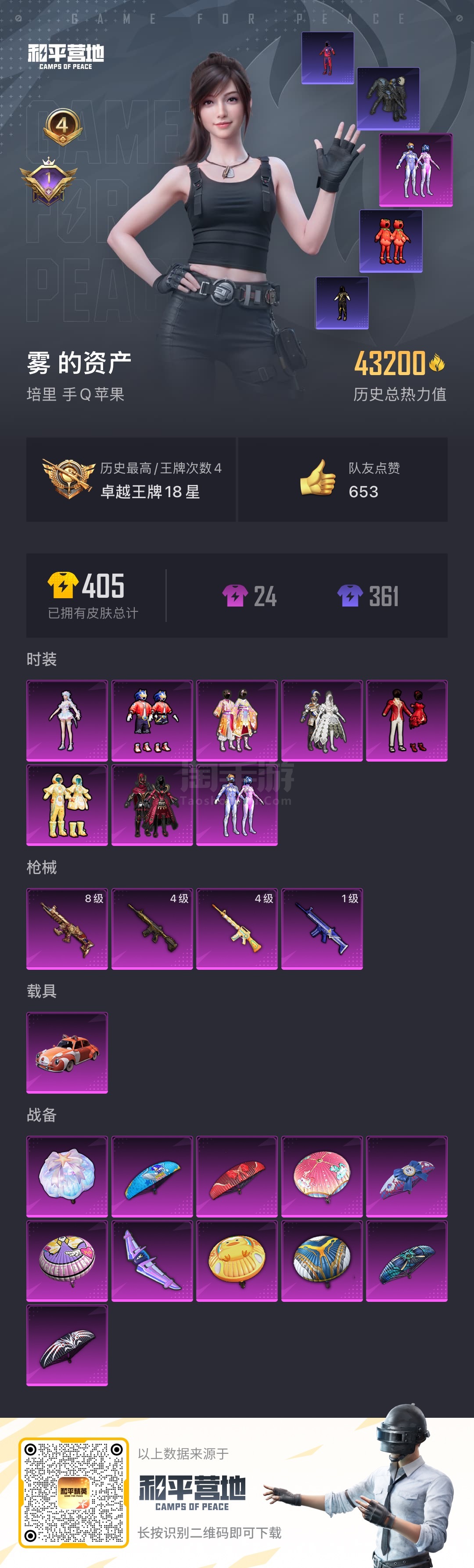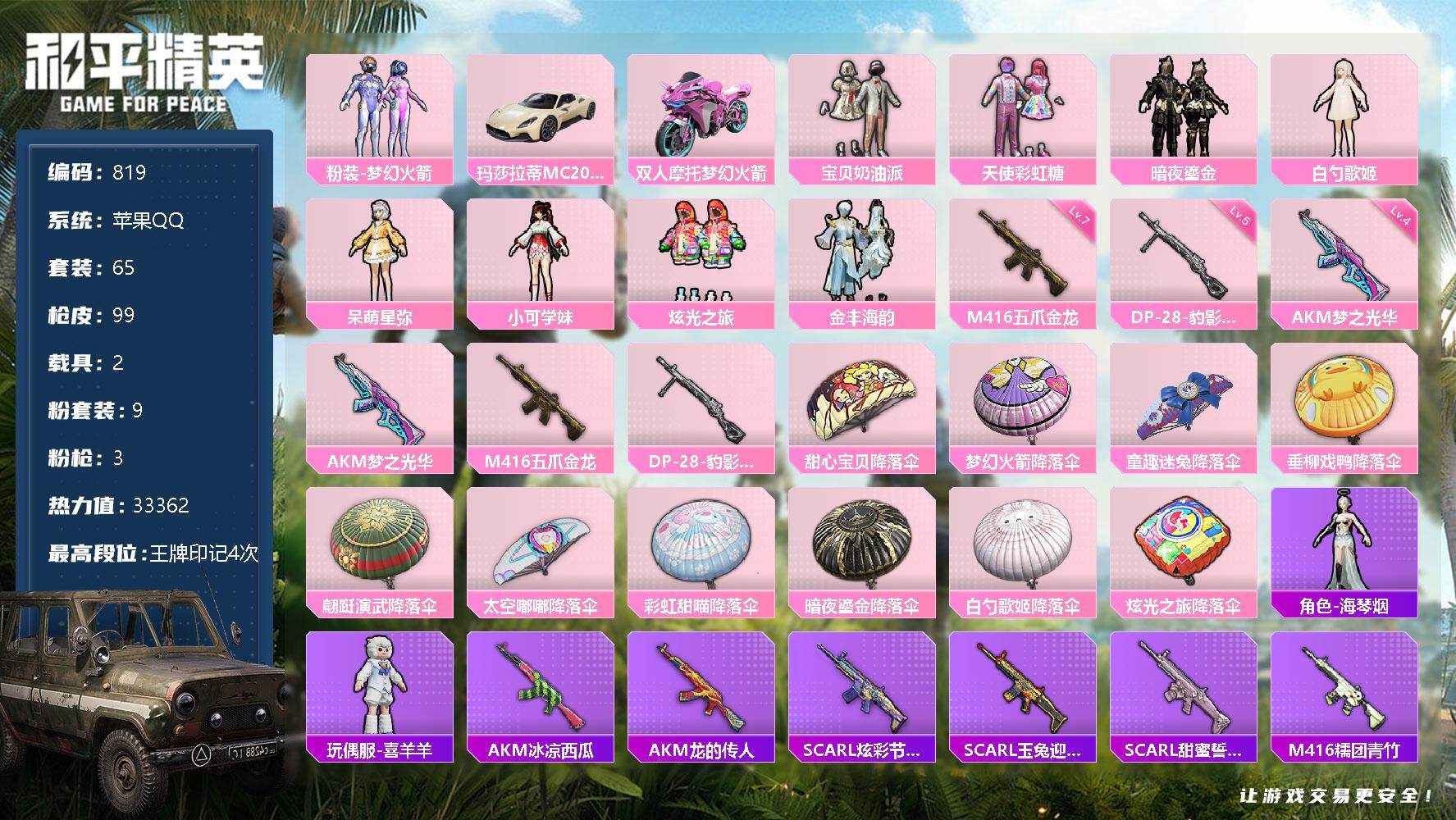 苹果手Q-5王牌印记-5粉装-4特效枪-2载具-30398热力值-58套装-86枪皮-1卓越印记-1