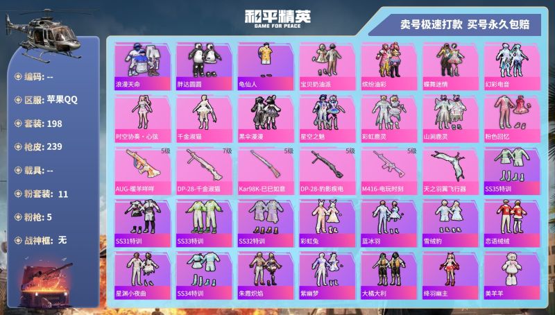 hs43853 苹果手Q-14王牌印记-11粉装-5特效枪-0载具-76486热力值-198套装-2