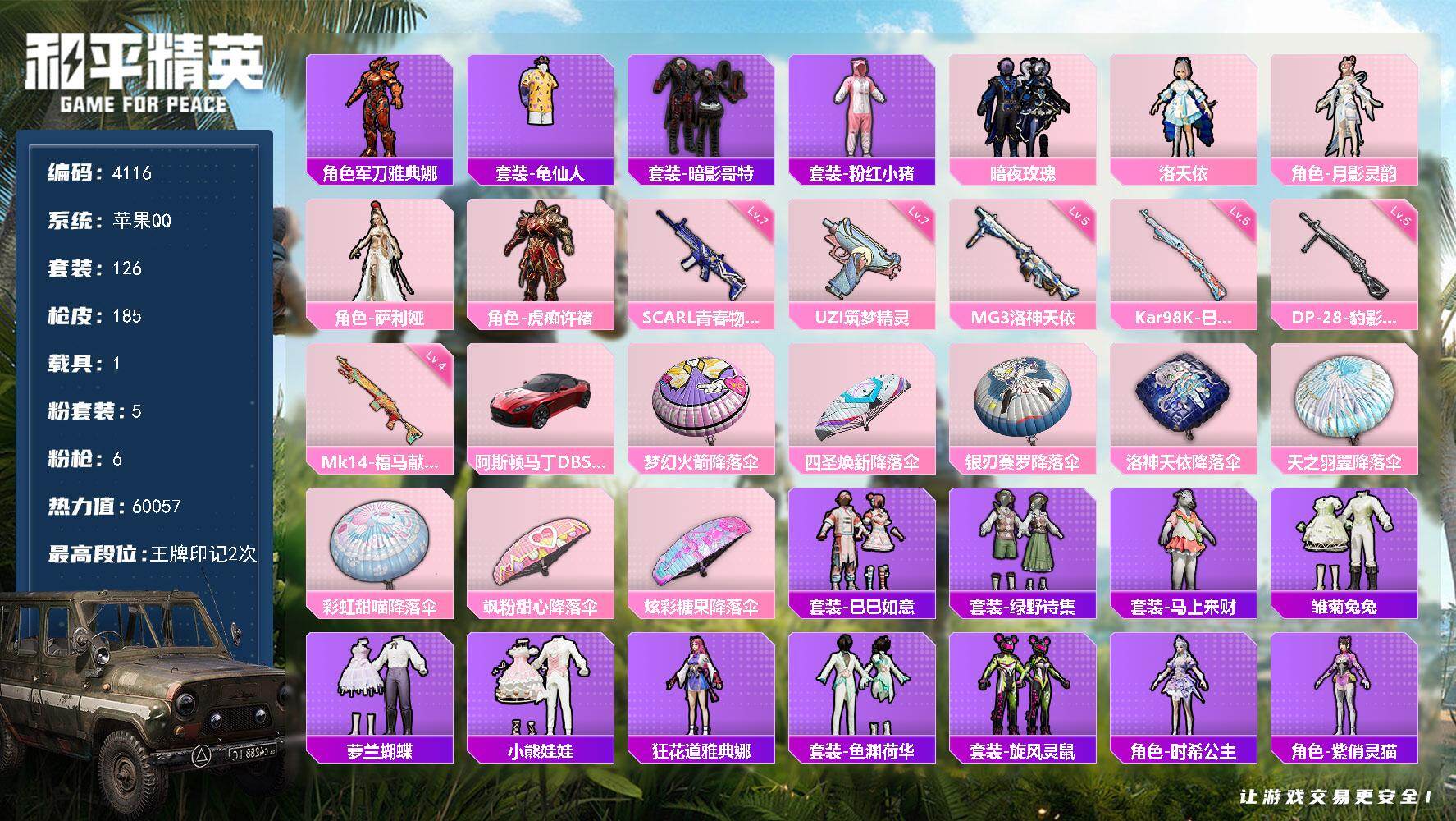 126套装/枪械6/装备197/载具1/战备112/王牌印记2/热力值60057/