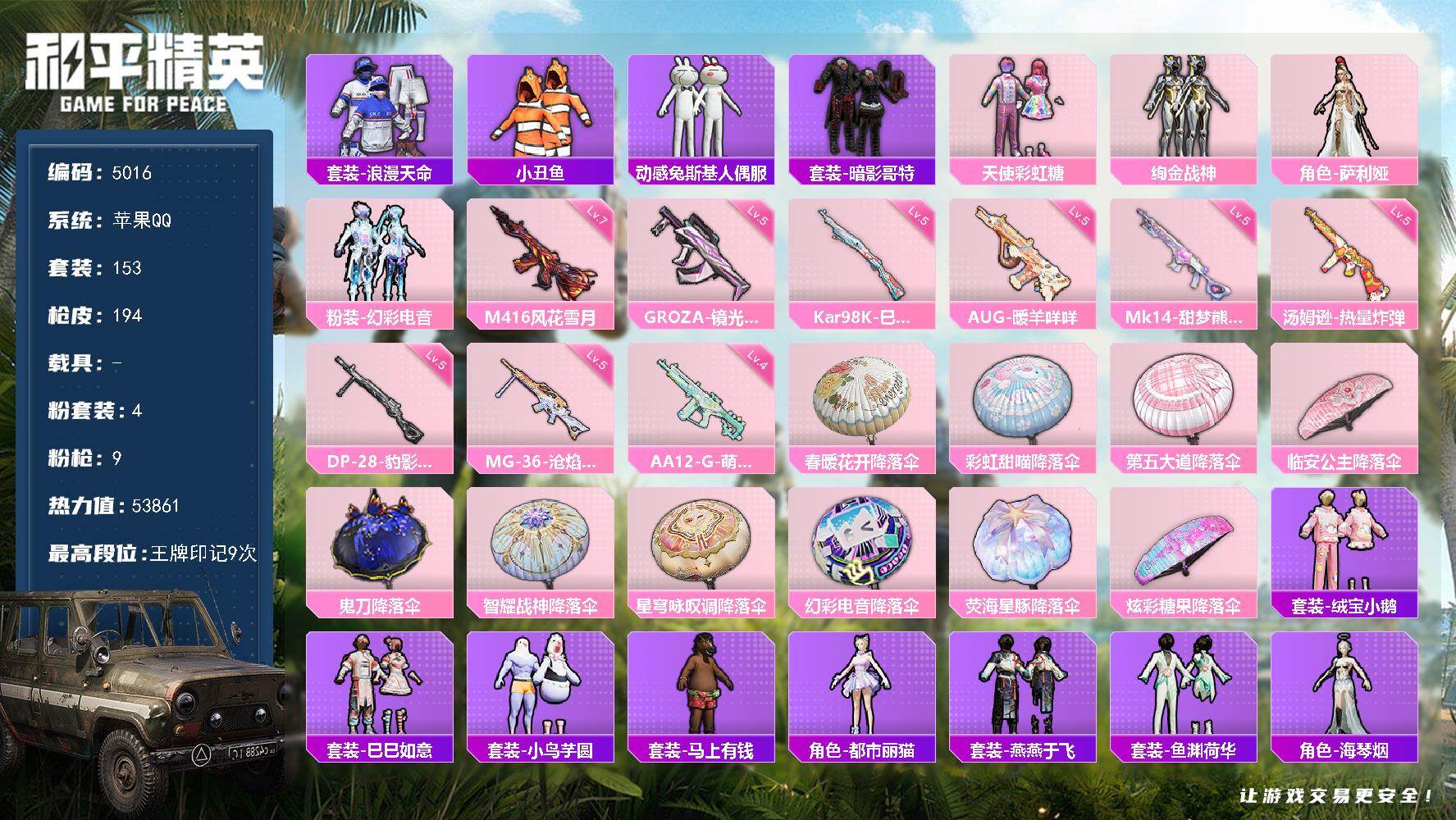 苹果 手Q-4粉装-9特效枪-0载具-0粉色飞行器-53861热力值-9王牌印记