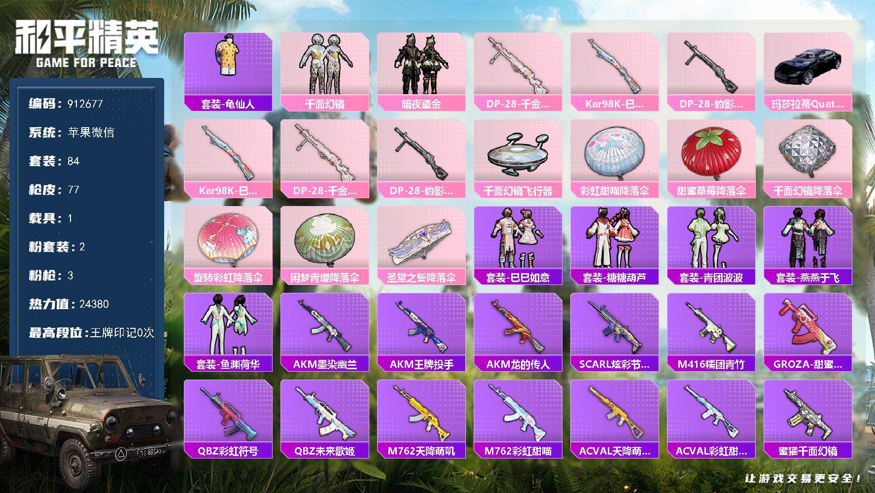 2粉装-3特效枪-1载具-1粉色飞行器-24380热力值-1王牌印记-84套装-77枪皮