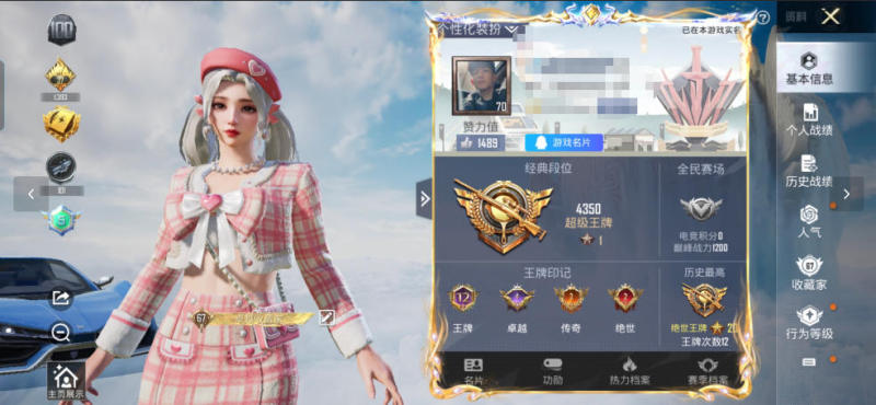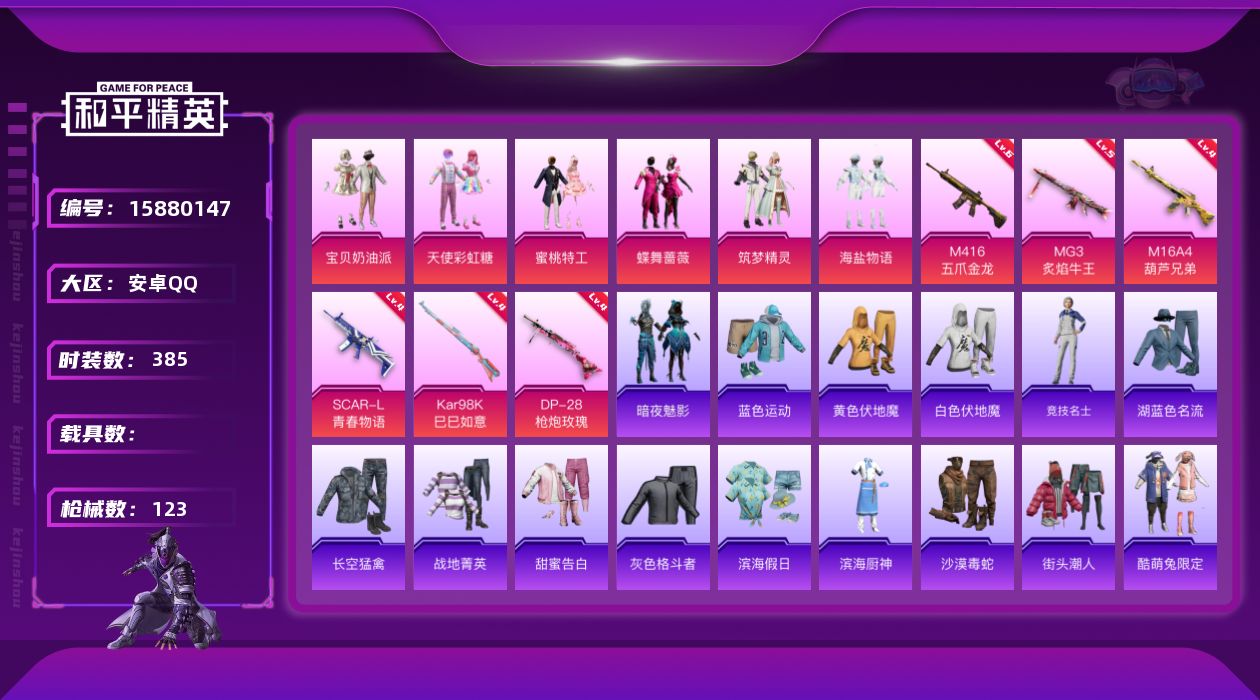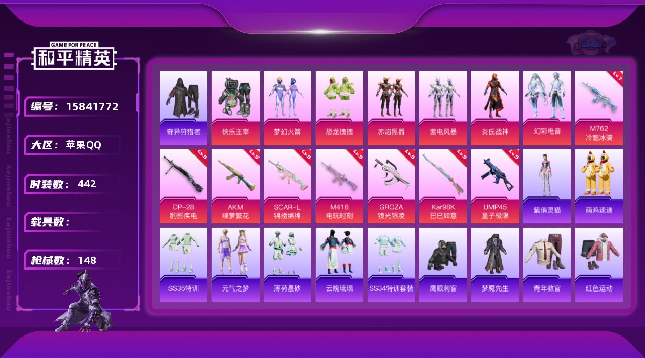 苹果v-2王牌印记-3粉装-5特效枪-1载具-16073热力值-28套装-39枪皮-2卓越印记-1