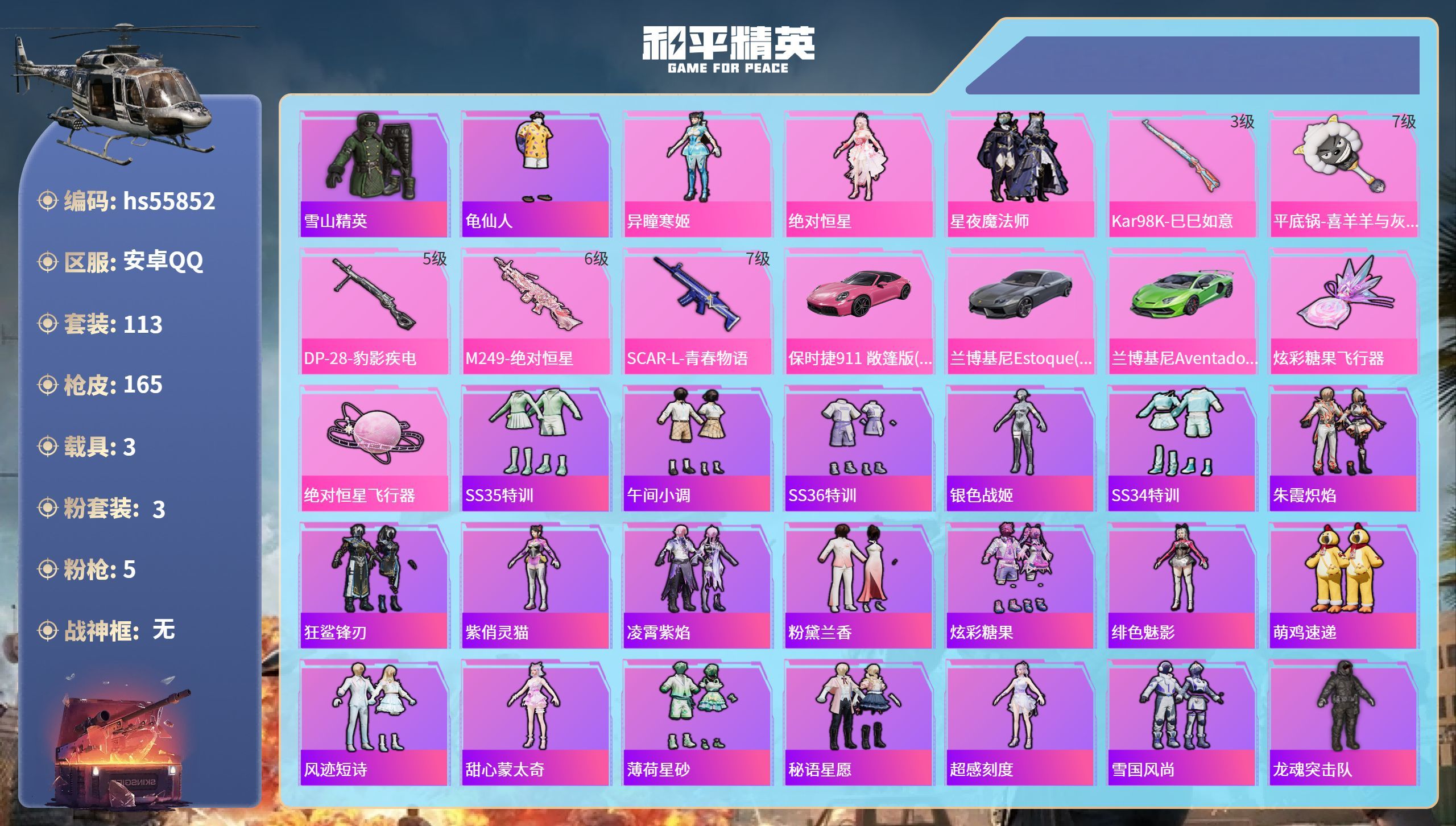 hs55852 安卓手Q-10王牌印记-3粉装-5特效枪-3载具-53403热力值-113套装-16