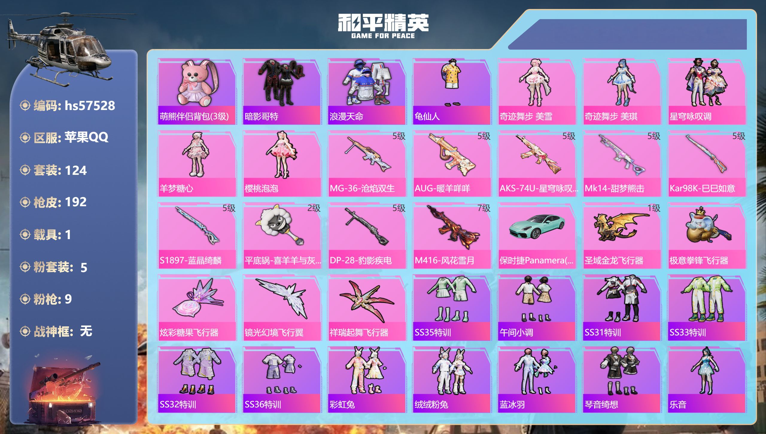 hs57528 苹果手Q-12王牌印记-5粉装-9特效枪-1载具-57893热力值-124套装-19