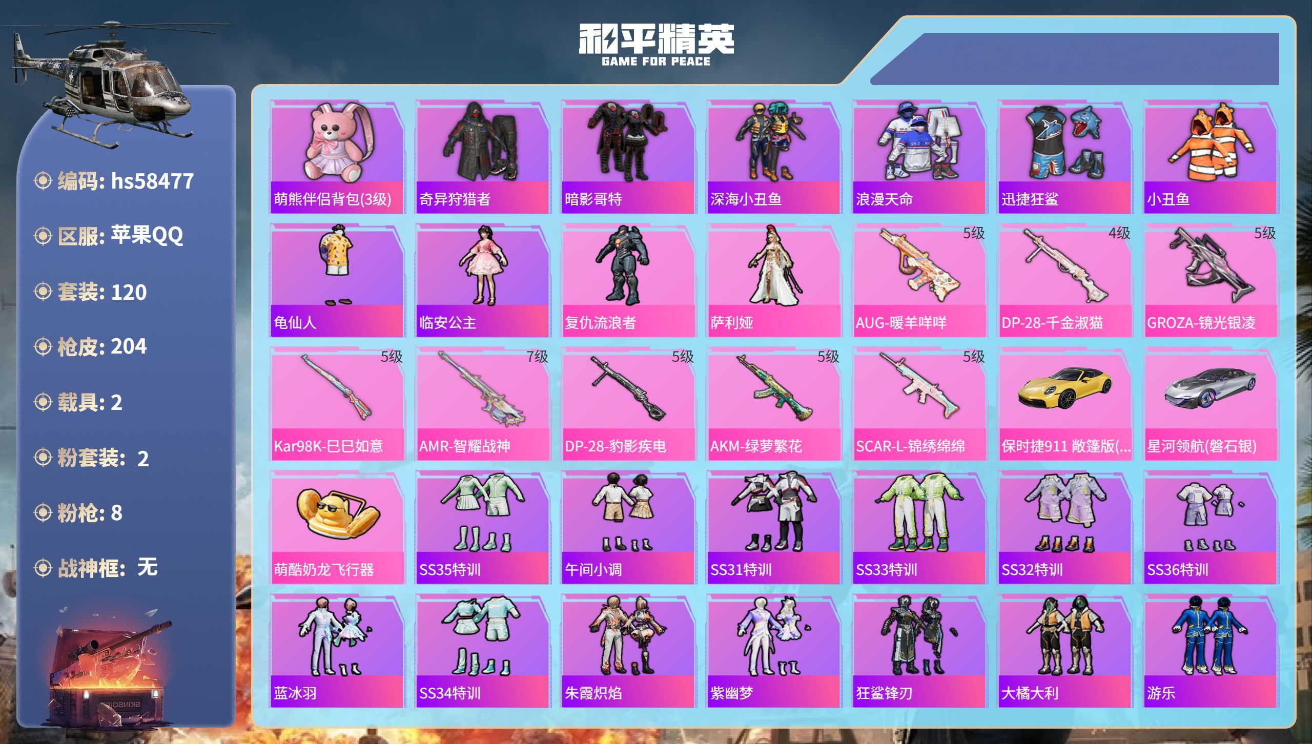 hs58477 苹果手Q-13王牌印记-2粉装-8特效枪-2载具-57761热力值-120套装-20