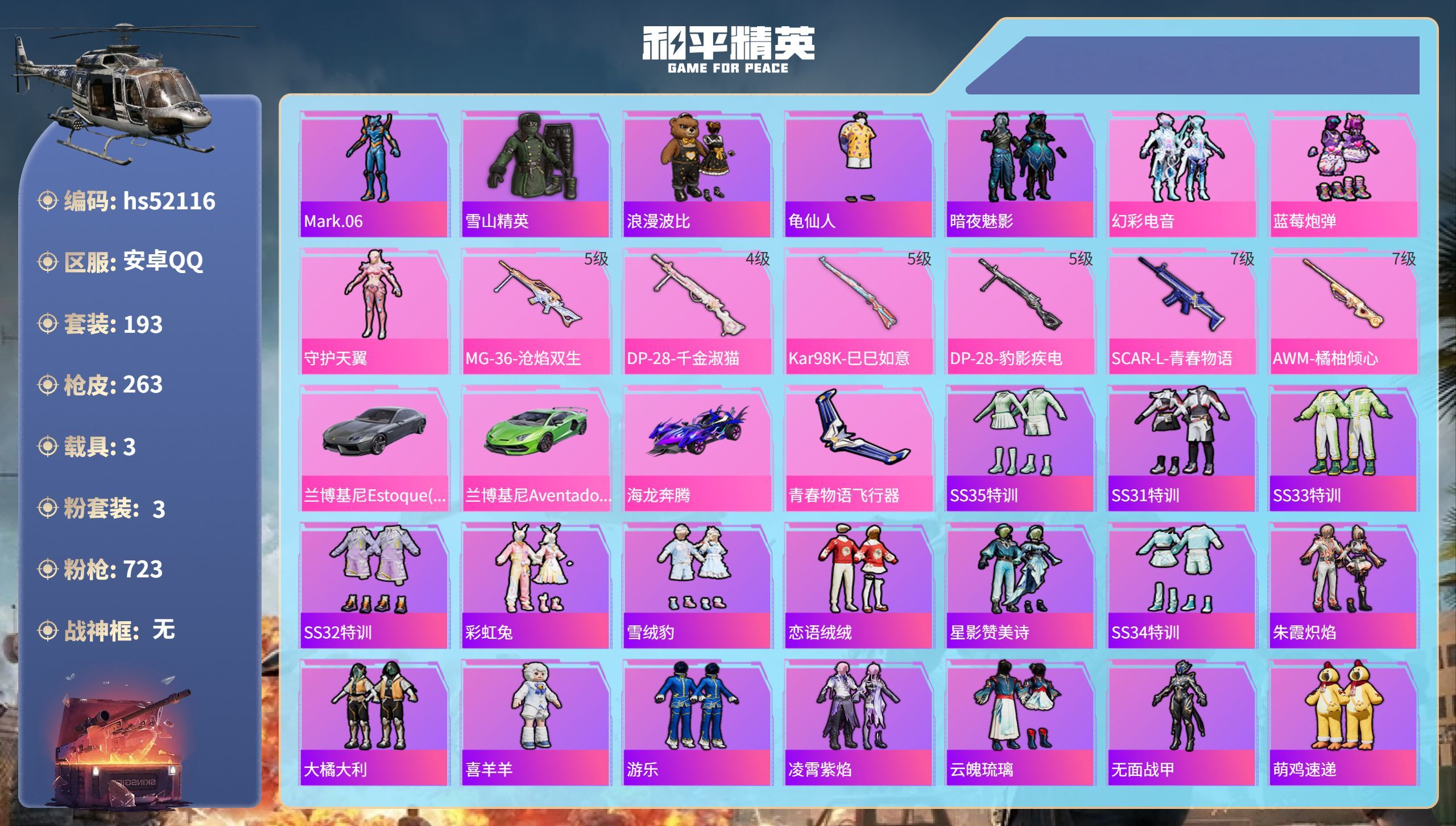 hs52116 安卓手Q-19王牌印记-3粉装-6特效枪-3载具-80655热力值-193套装-26