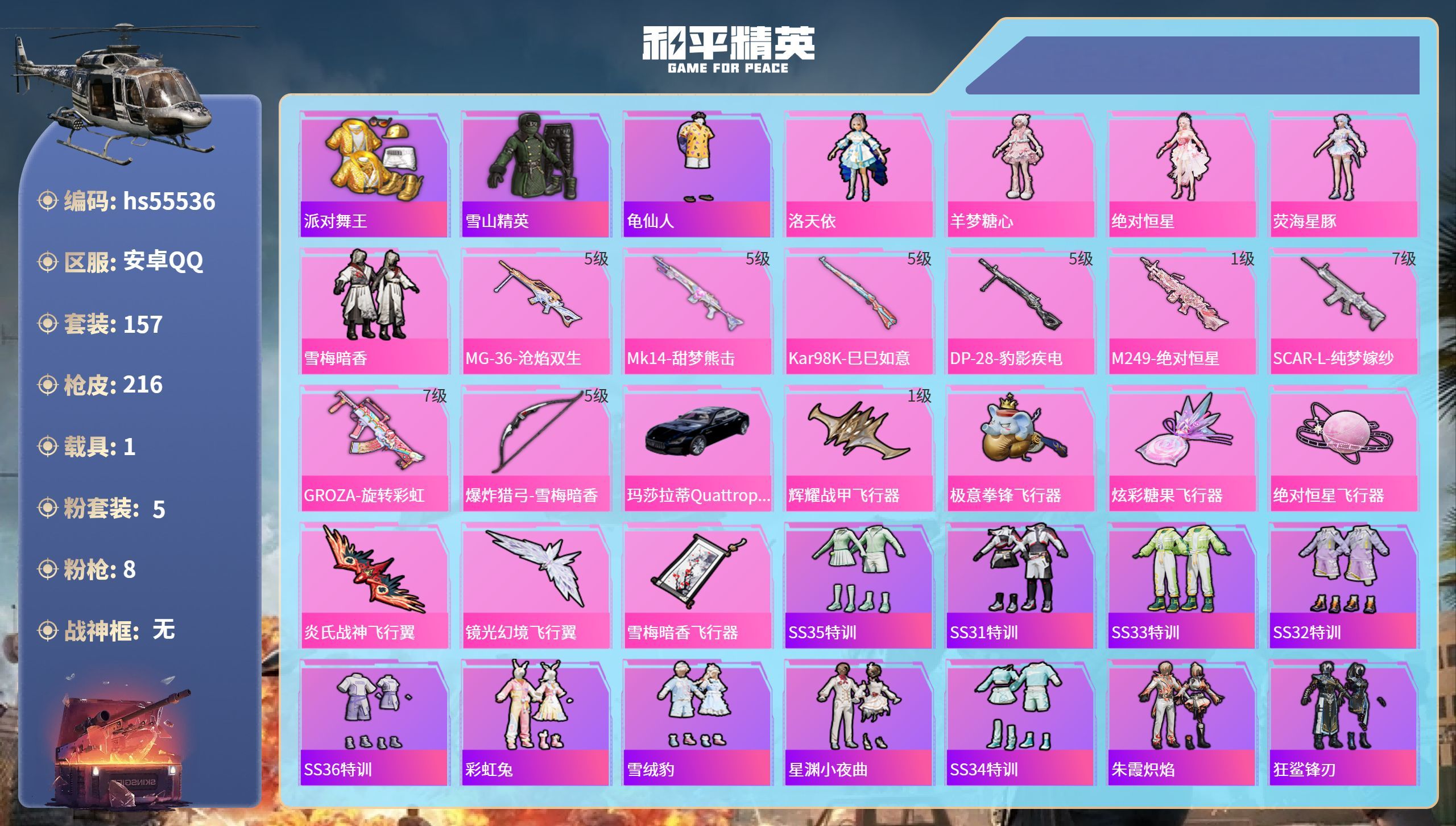 hs55536 安卓手Q-7王牌印记-5粉装-8特效枪-1载具-69648热力值-157套装-216