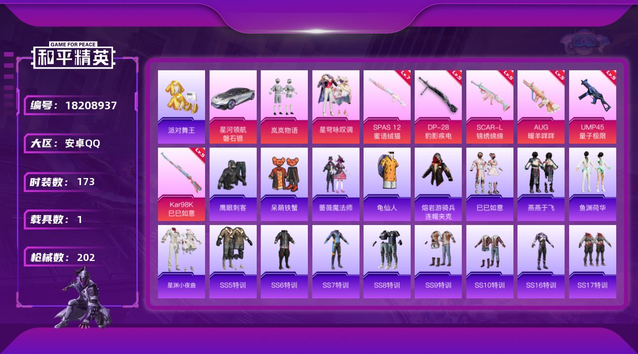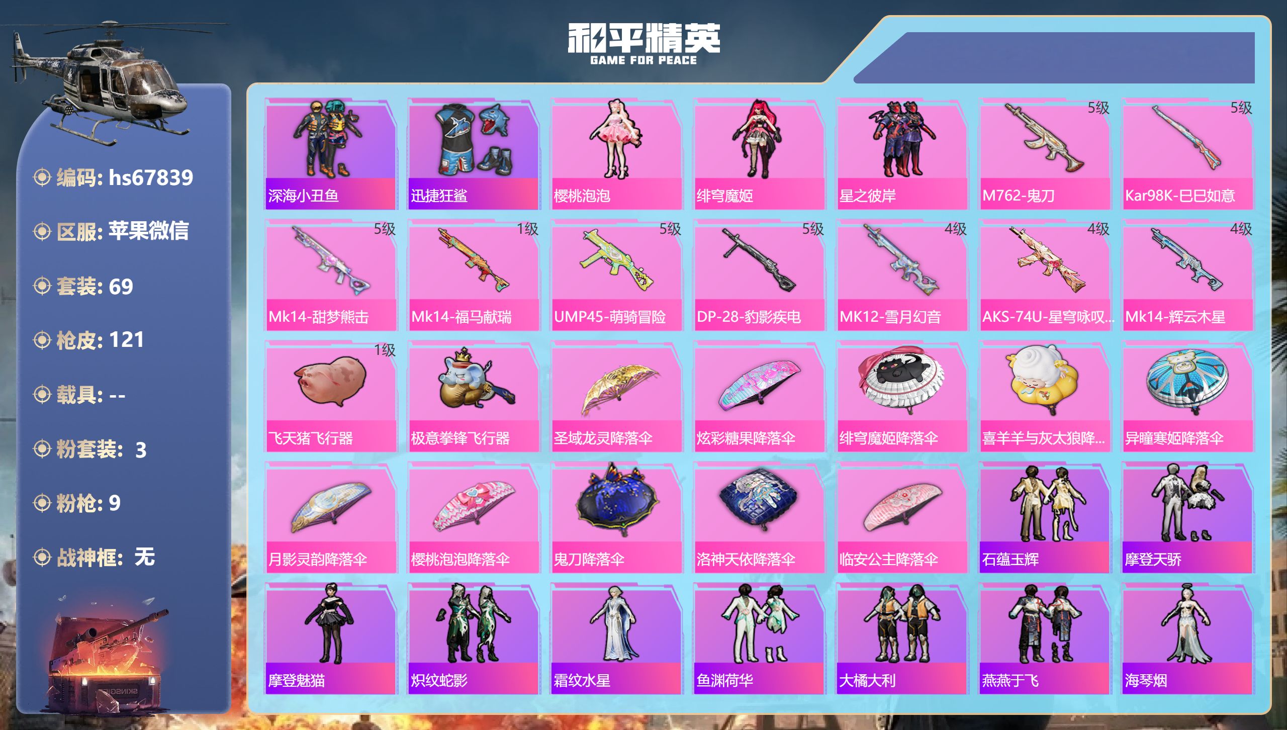 3粉装-3特效枪-3载具-1粉色飞行器-36133热力值-4王牌印记-75套装-111枪皮