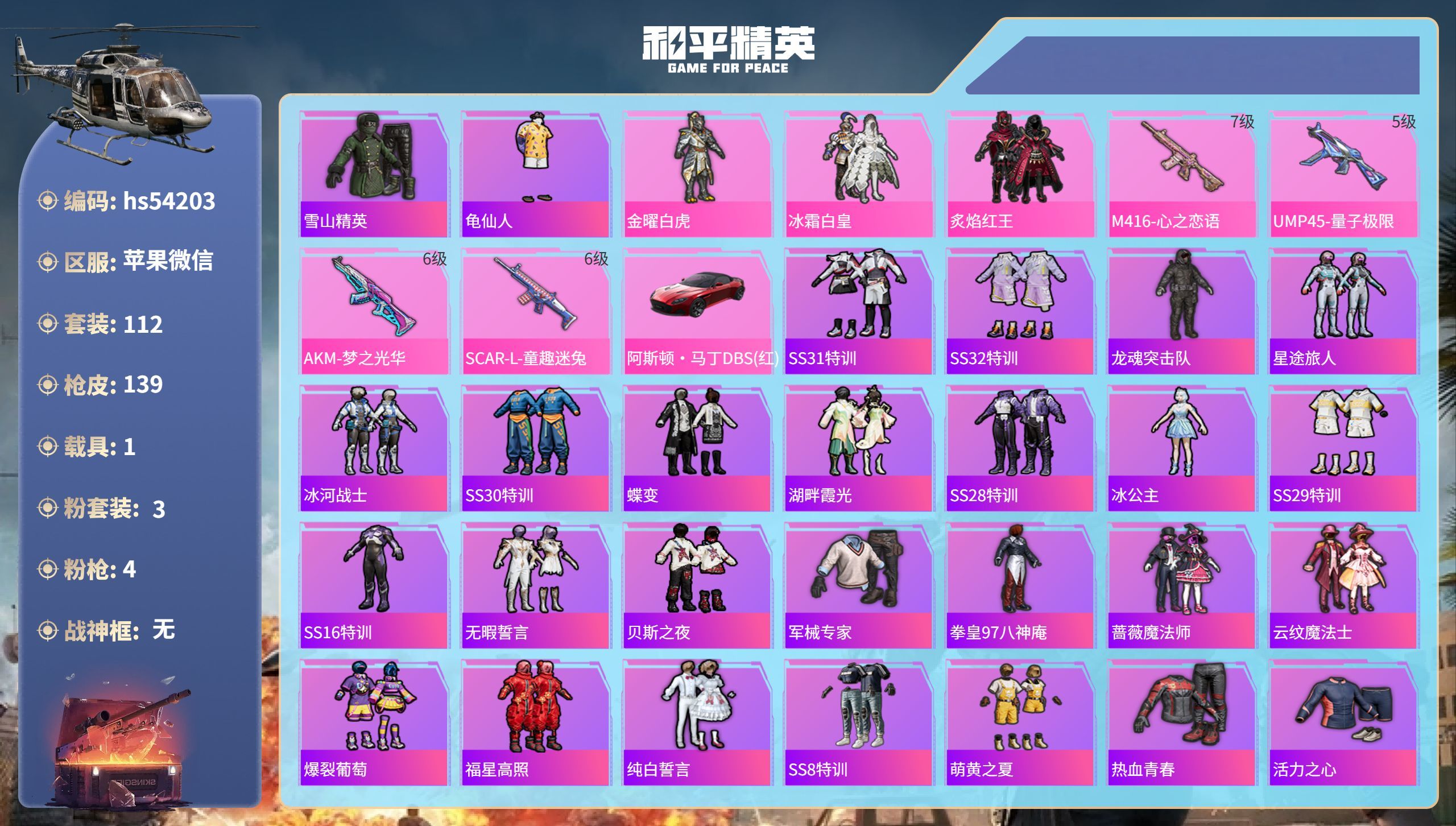 hs54203 苹果v-8王牌印记-3粉装-4特效枪-1载具-47024热力值-112套装-139