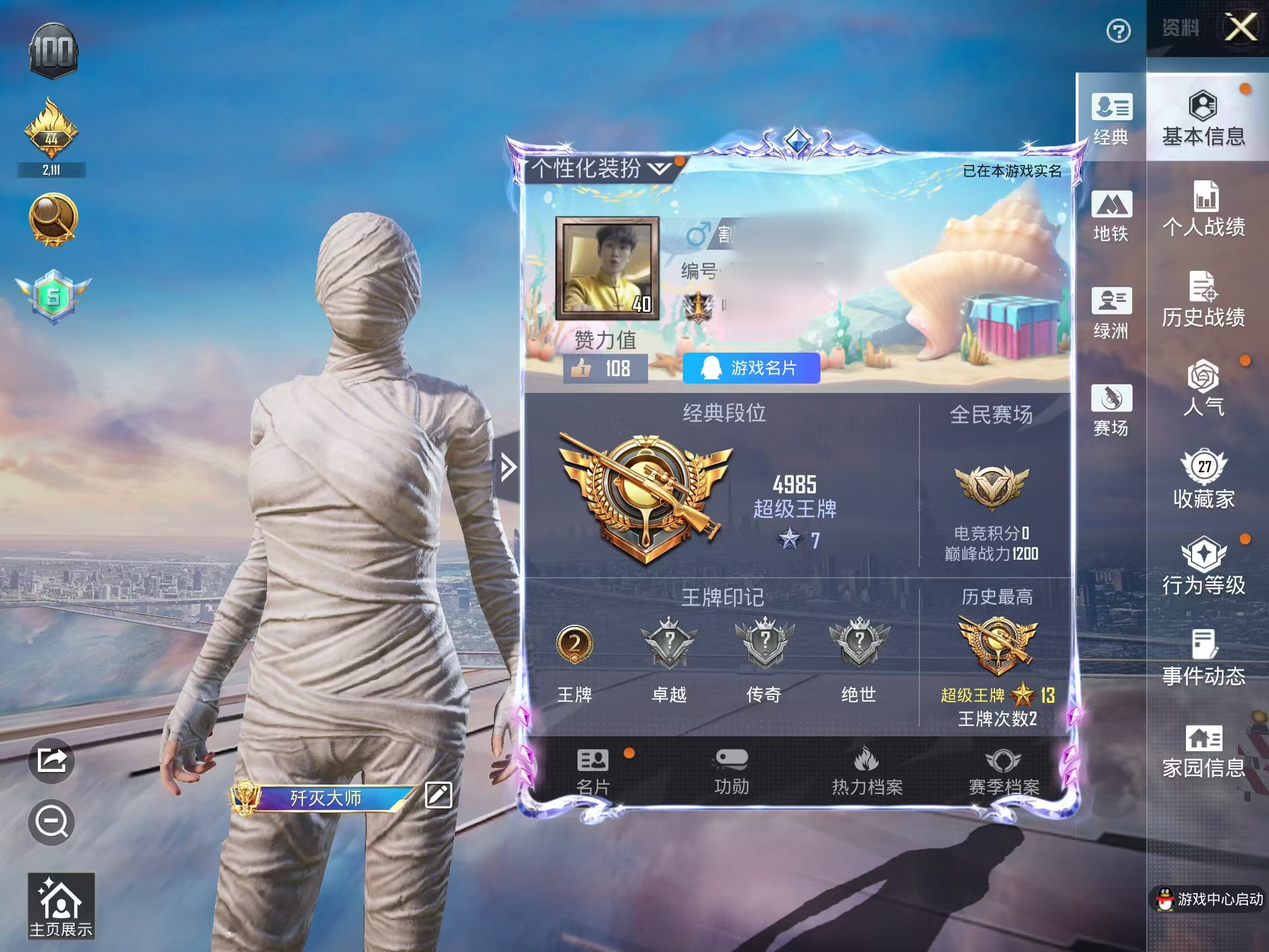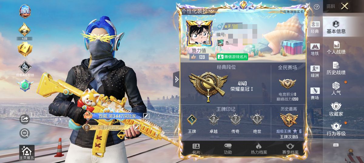 3稀有3载具5粉装5特效枪5热门134套装176枪皮 57496热力值 12印记 历史超级王牌11星