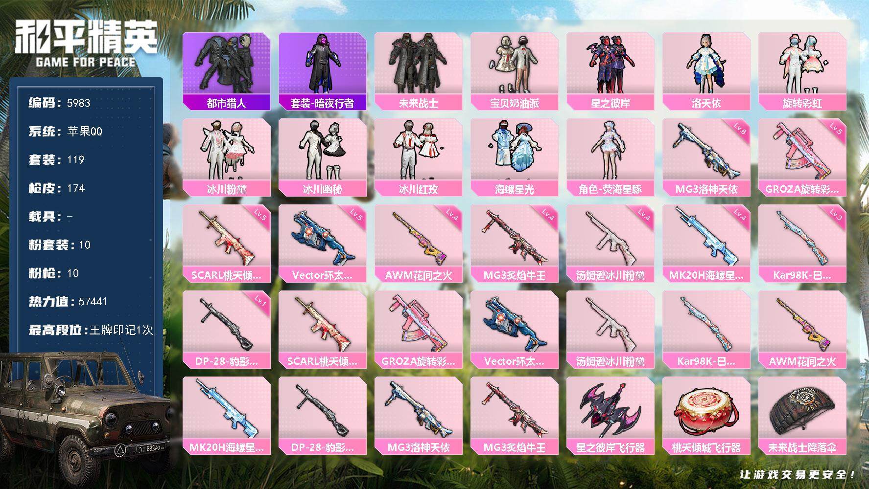 hs46578 苹果手Q-5王牌印记-4粉装-11特效枪-1载具-48862热力值-98套装-160