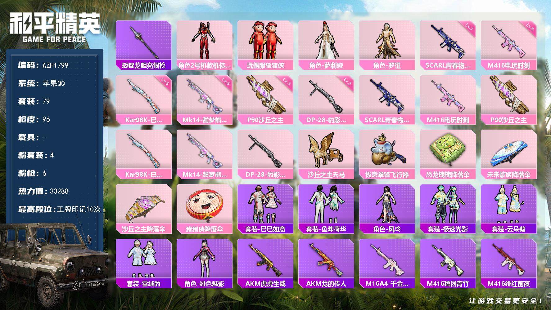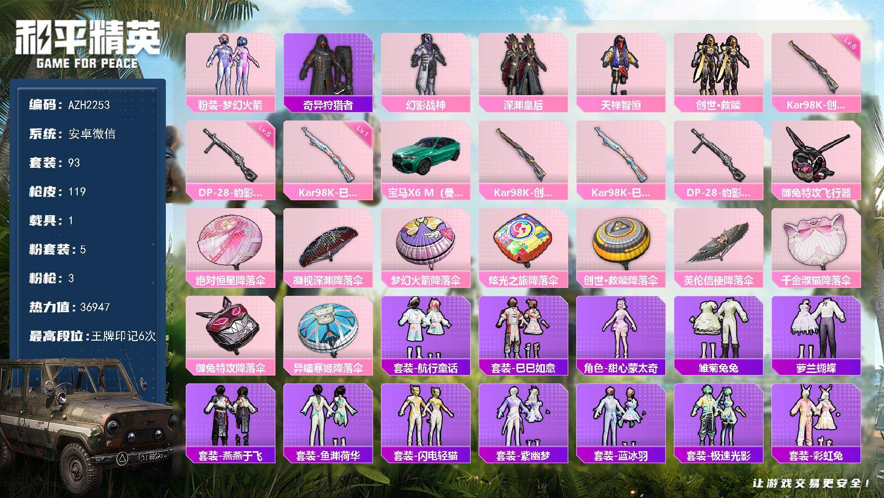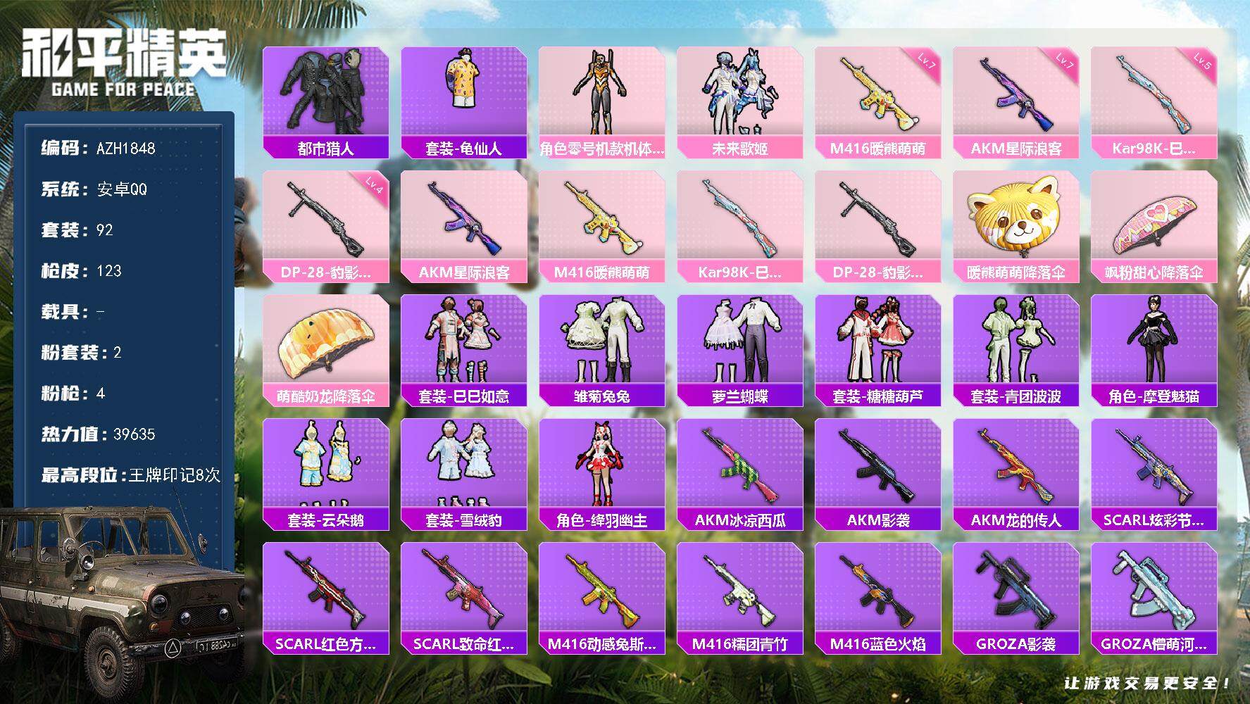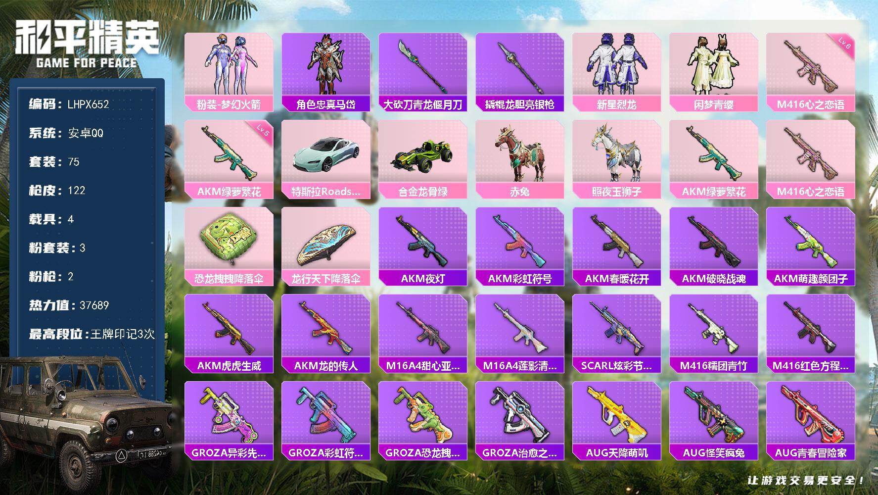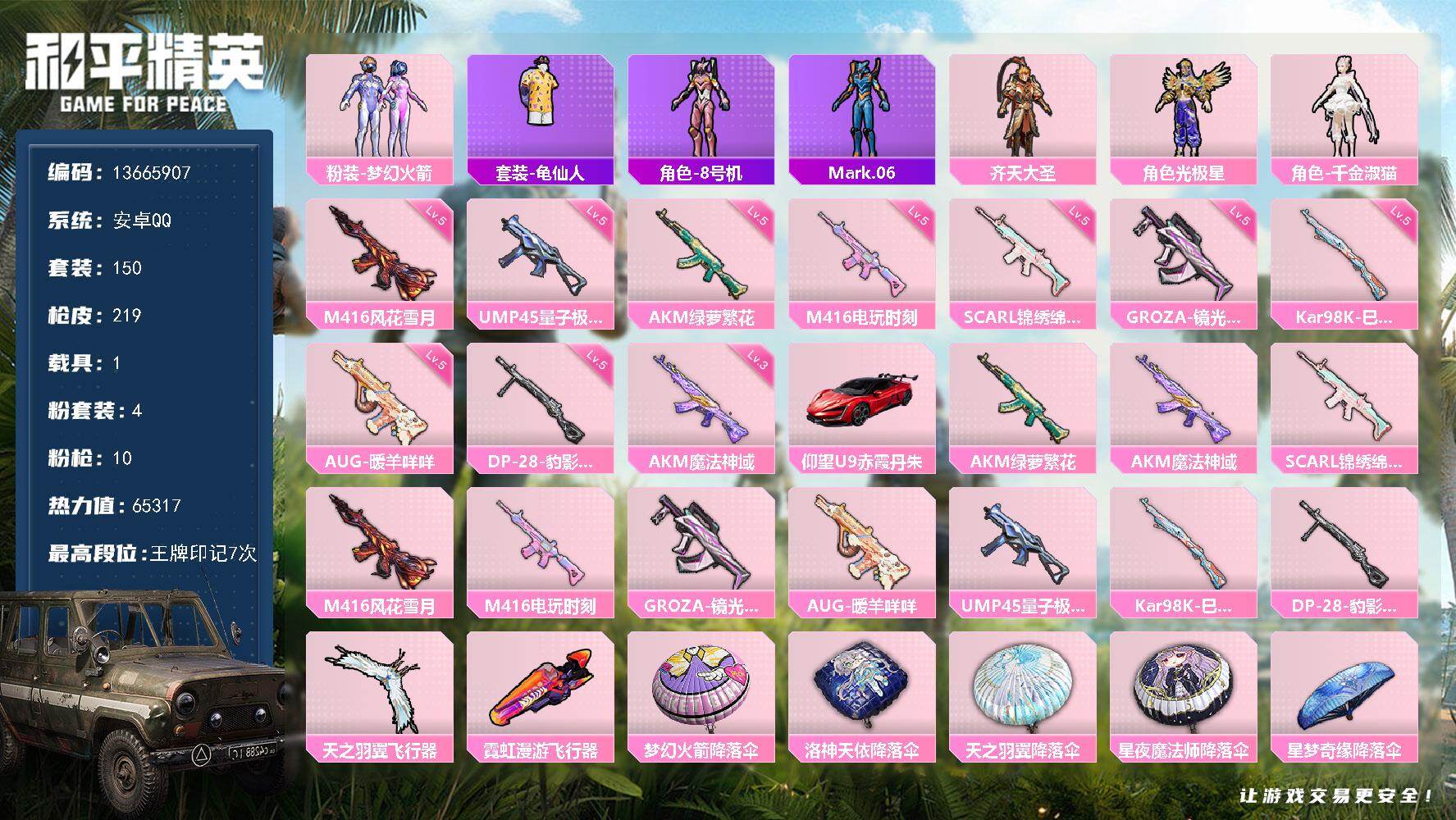【店主推荐捡漏号!可直接换绑】安卓 手Q-3粉装-2特效枪-4载具-0粉色飞行