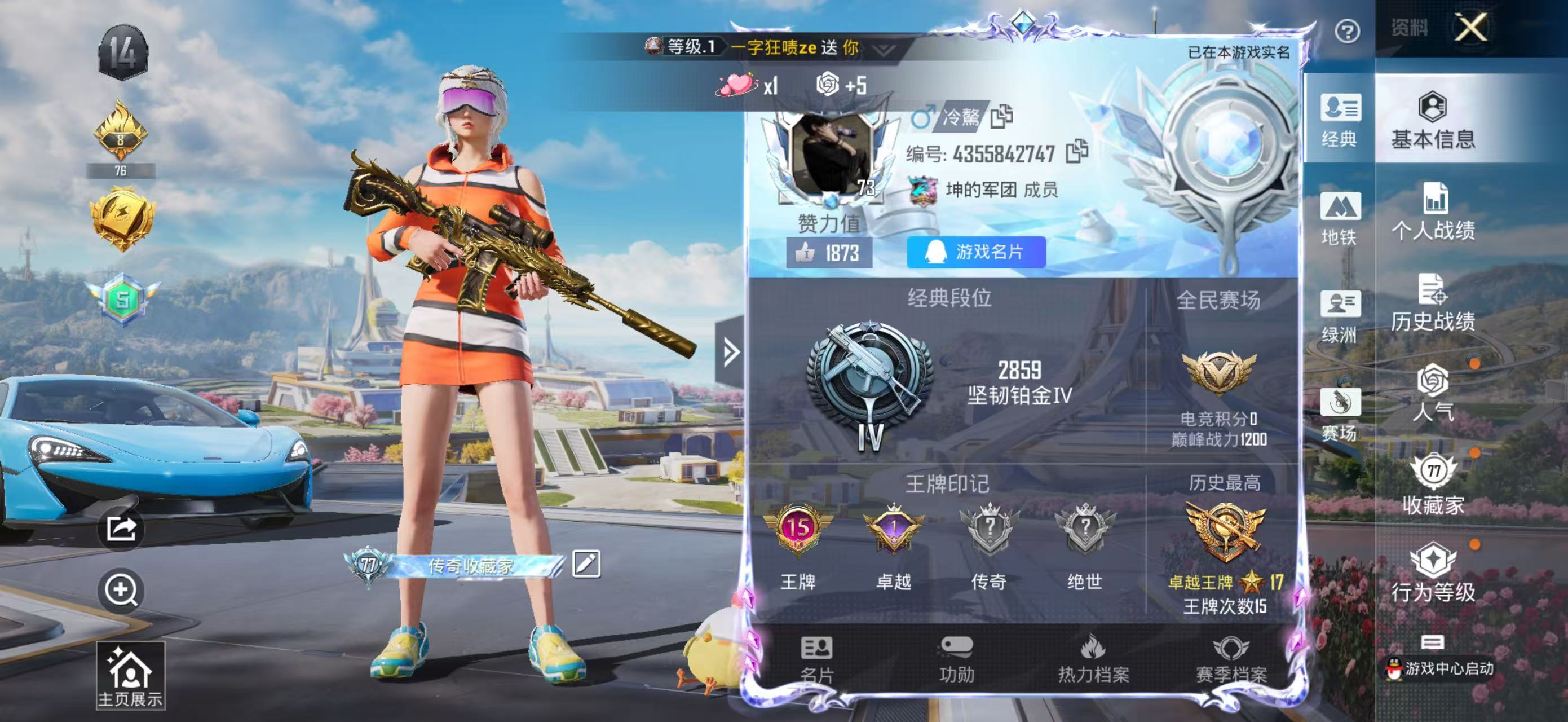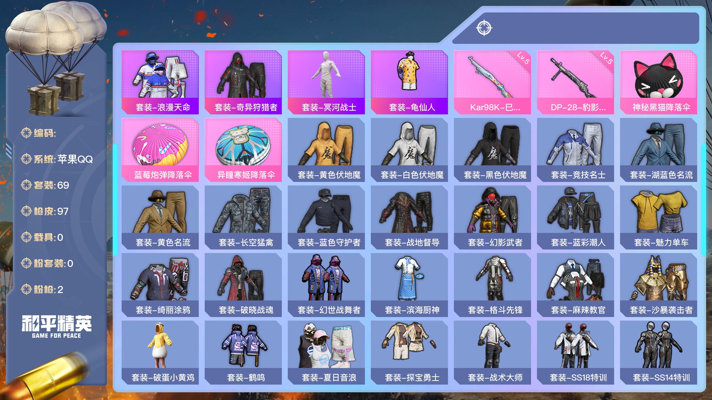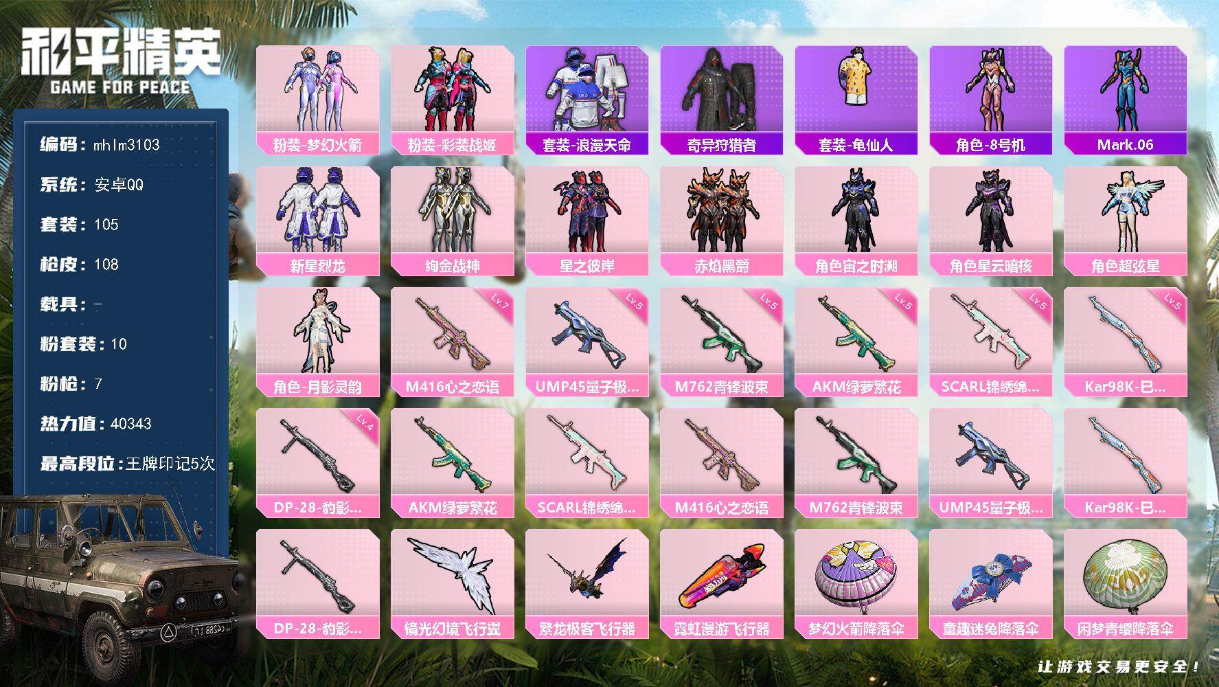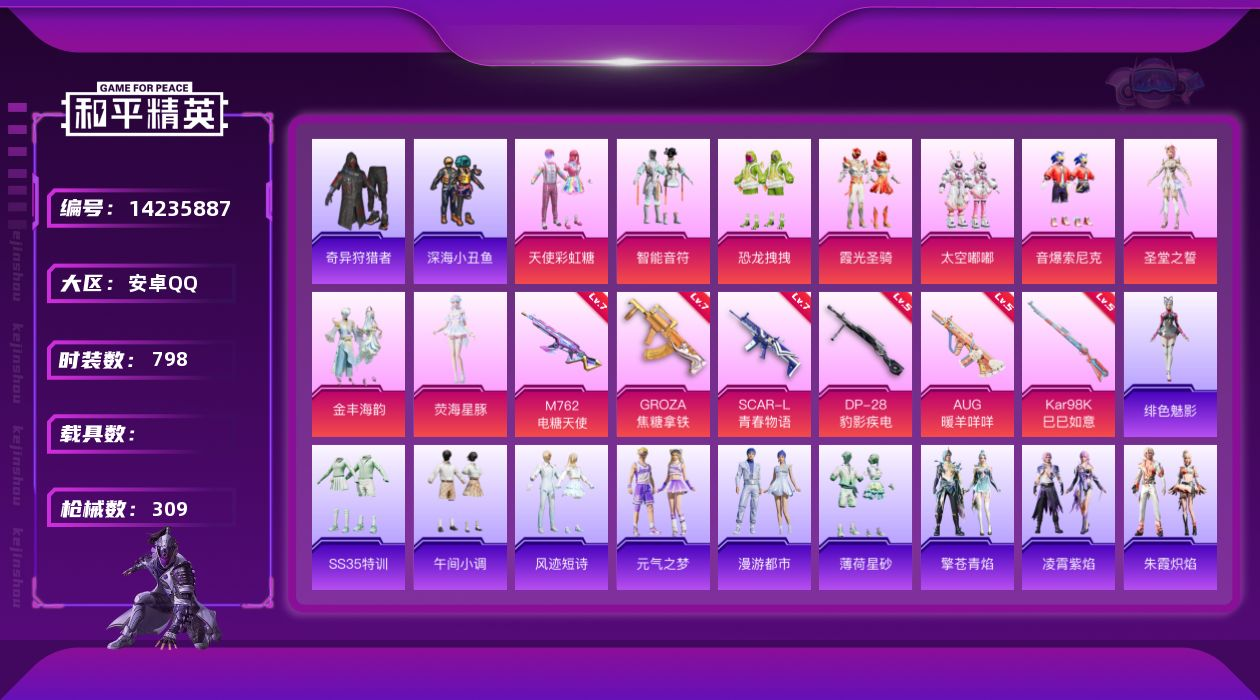 6粉装-5特效枪-1载具-3粉色飞行器-57887热力值-6王牌印记-113套装-169枪皮