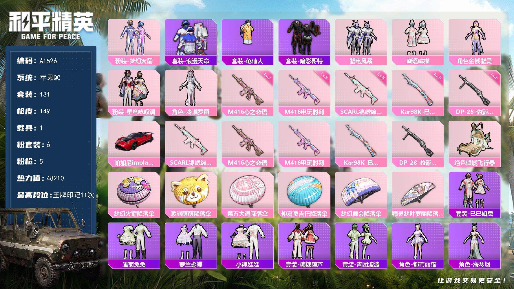 hs47070 苹果手Q-15王牌印记-8粉装-3特效枪-4载具-101610热力值-222套装-3