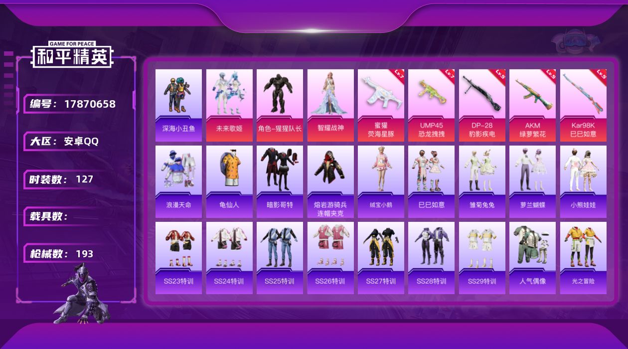 1载具-8粉装-7特效枪-114套装-184枪皮-8王牌印记-不朽星钻Ⅳ-62870热力值