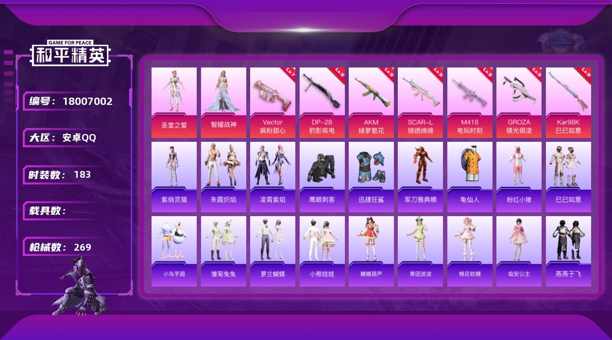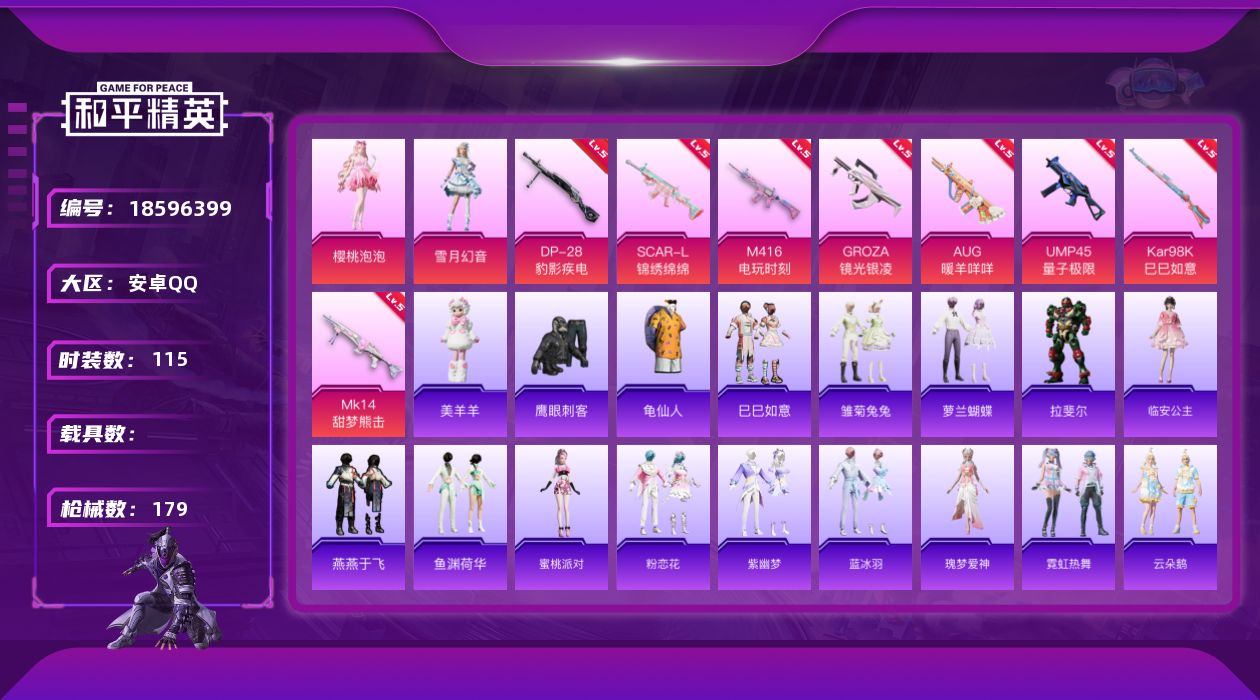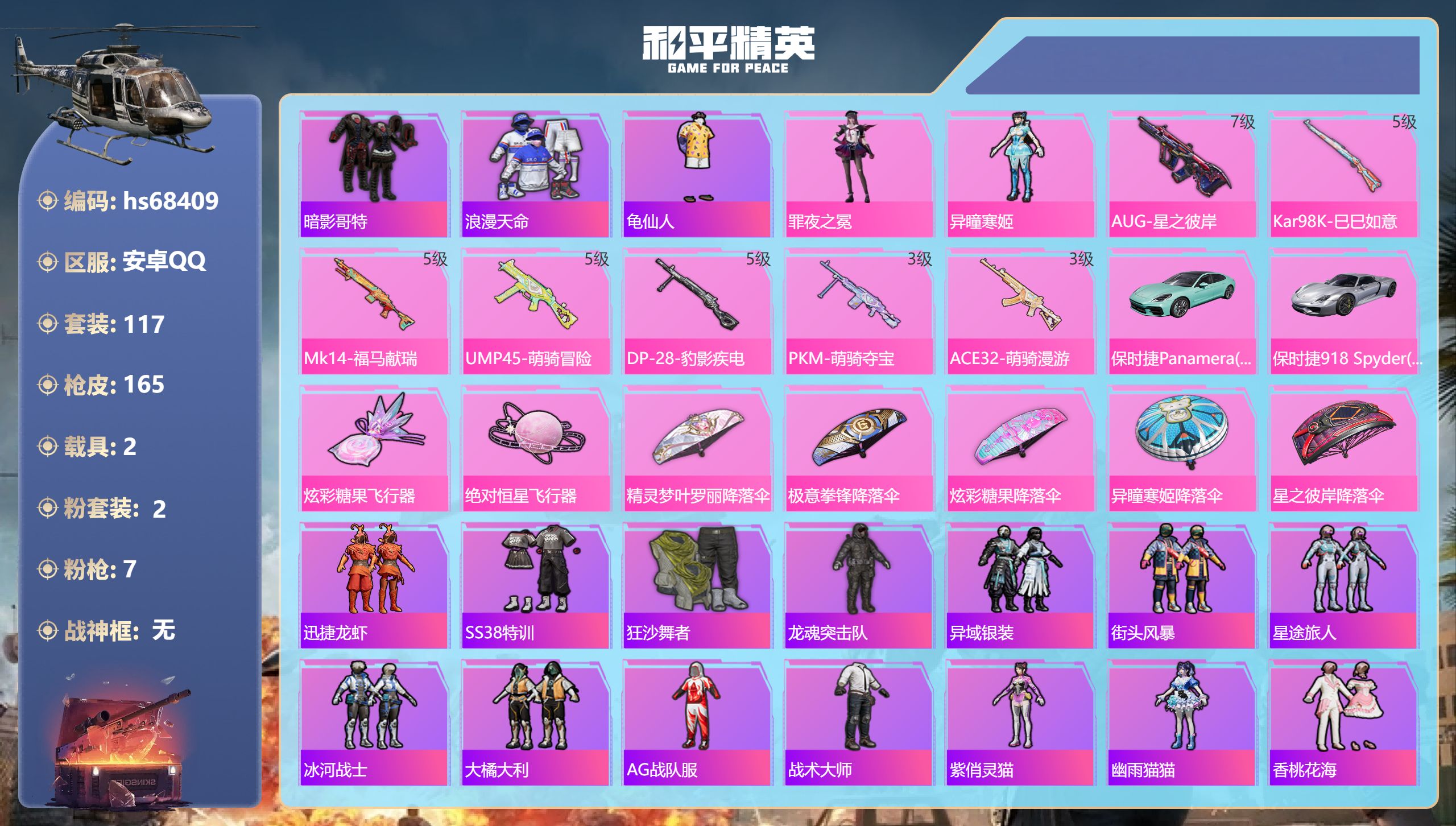 5粉装-5特效枪-0载具-0粉色飞行器-35686热力值-5王牌印记-105套装-122枪皮