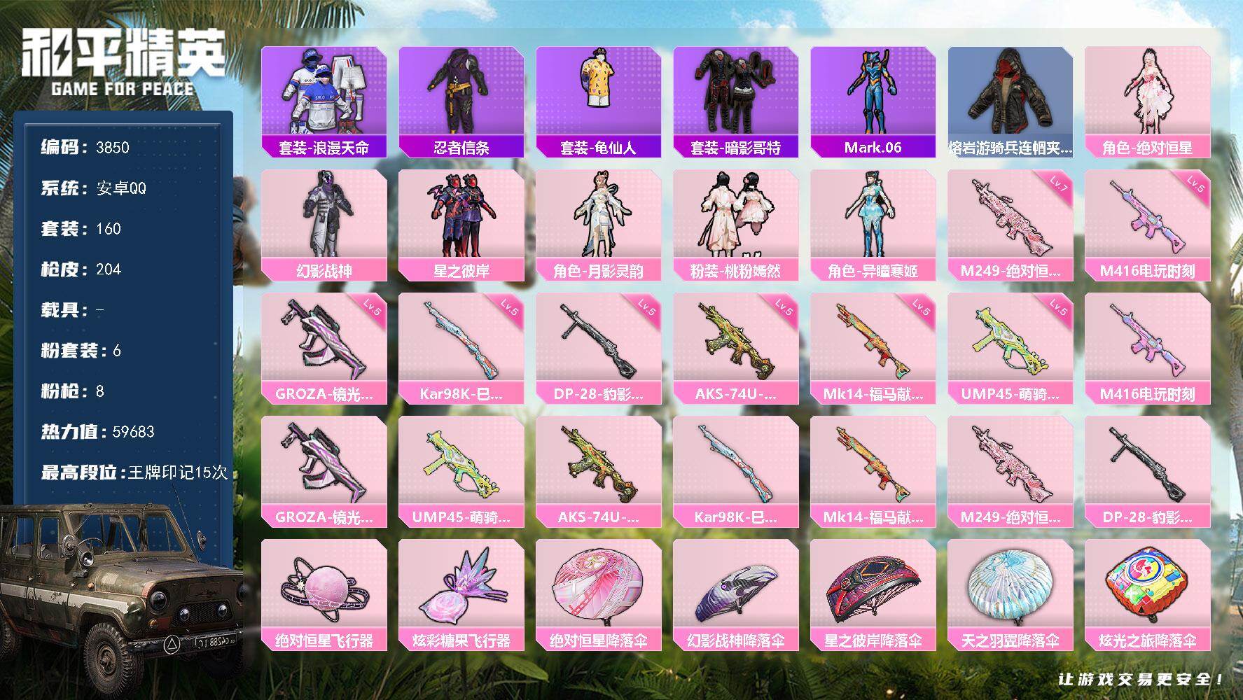 hs59022安卓手Q-10王牌印记-5粉装-3特效枪-1载具-35297热力值-93套装-109
