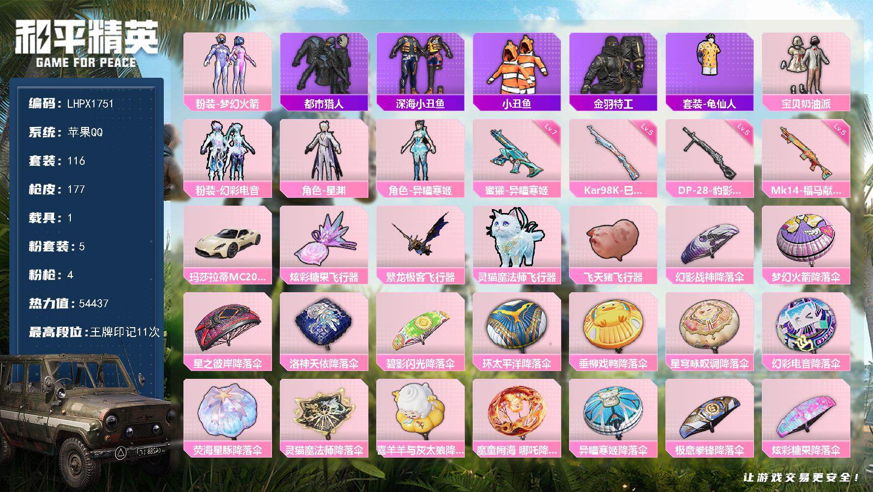 5粉装-4特效枪-1载具-4粉色飞行器-54437热力值-11王牌印记-116套装-177枪皮