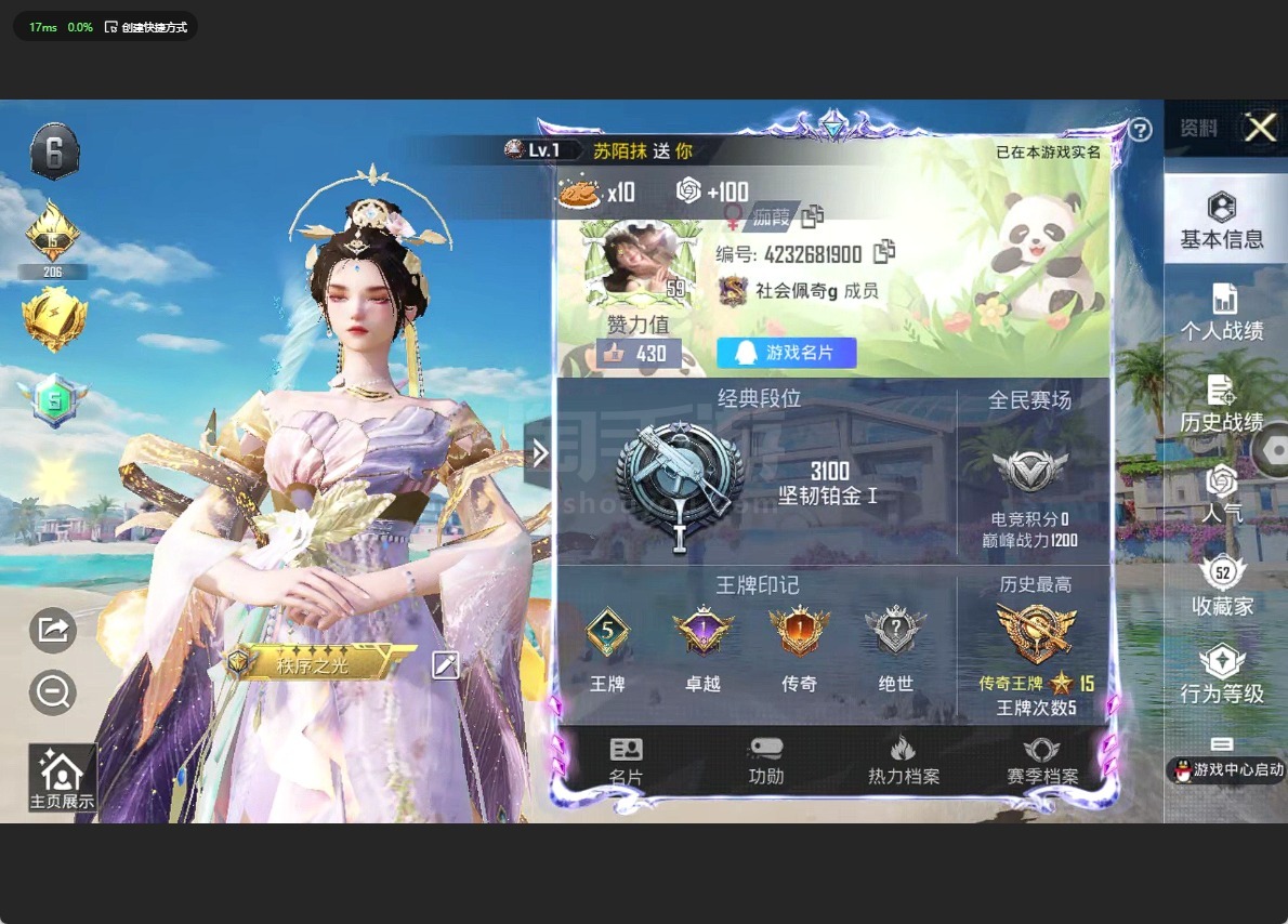 实名: 可修改 时装数: 206 载具数: 1 枪械数: 239 战备数: 1
