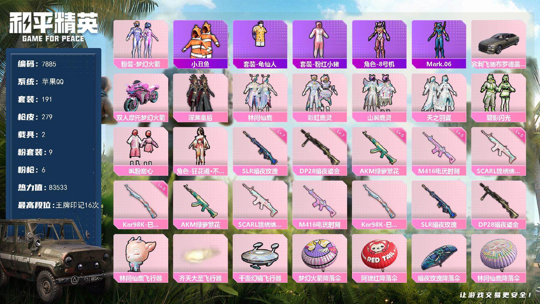 hs44982 苹果手Q-5王牌印记-4粉装-4特效枪-2载具-76846热力值-201套装-234