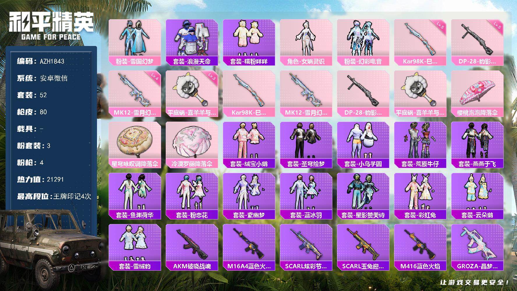 hs57090 安卓手Q-4王牌印记-3粉装-4特效枪-3载具-51777热力值-129套装-155