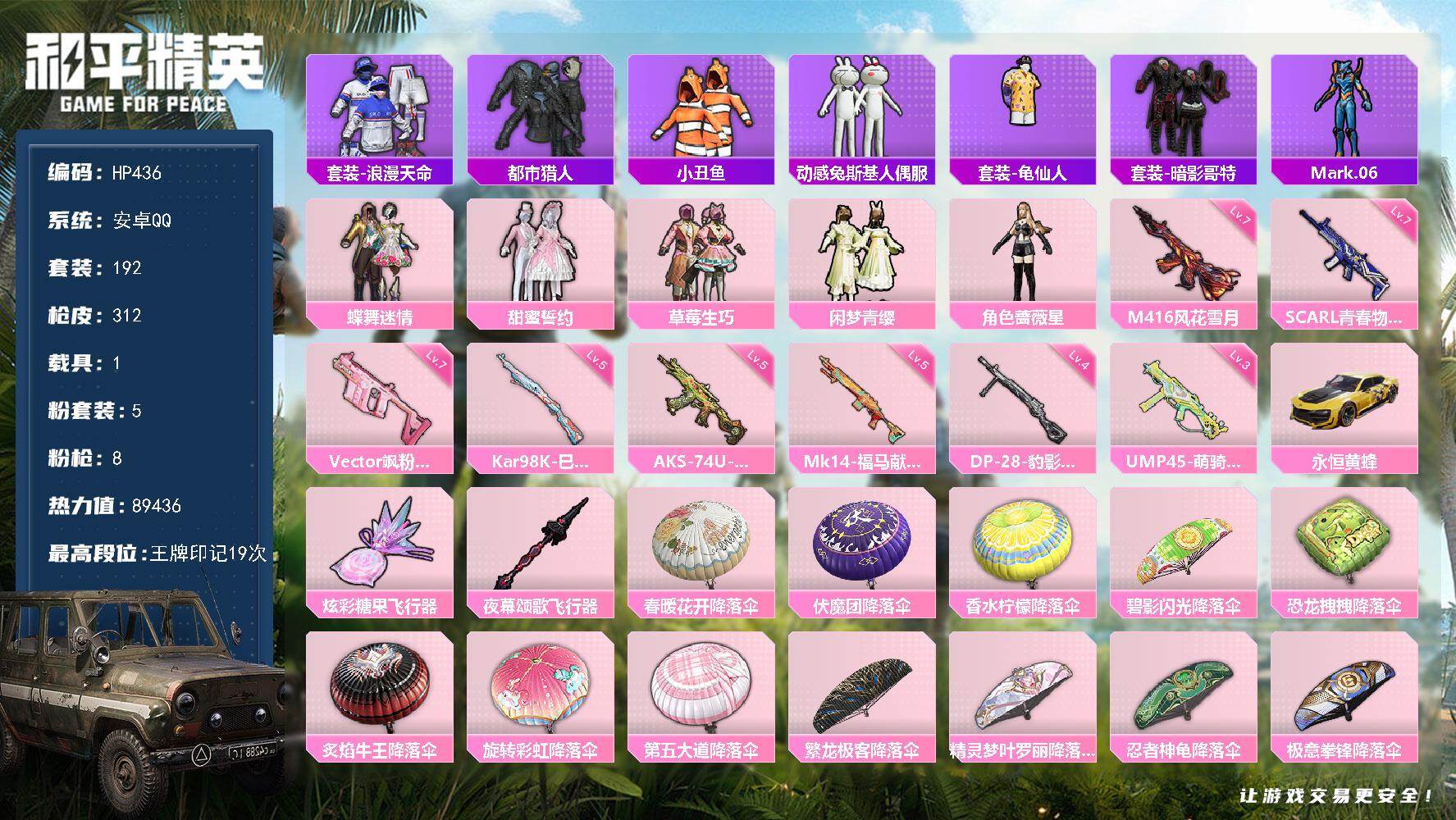 【秒换绑】安卓 手Q-5粉装-8特效枪-1载具-2粉色飞行器-89436热力值