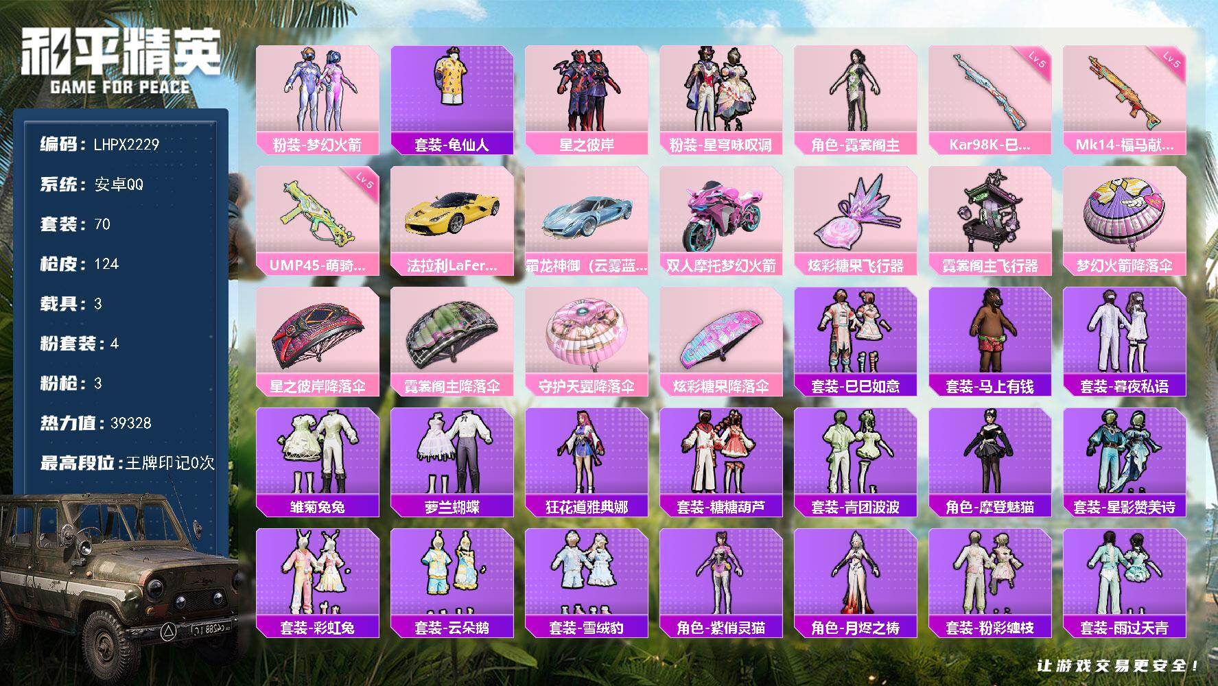 4粉装-3特效枪-3载具-2粉色飞行器-39328热力值-1王牌印记-70套装-124枪皮