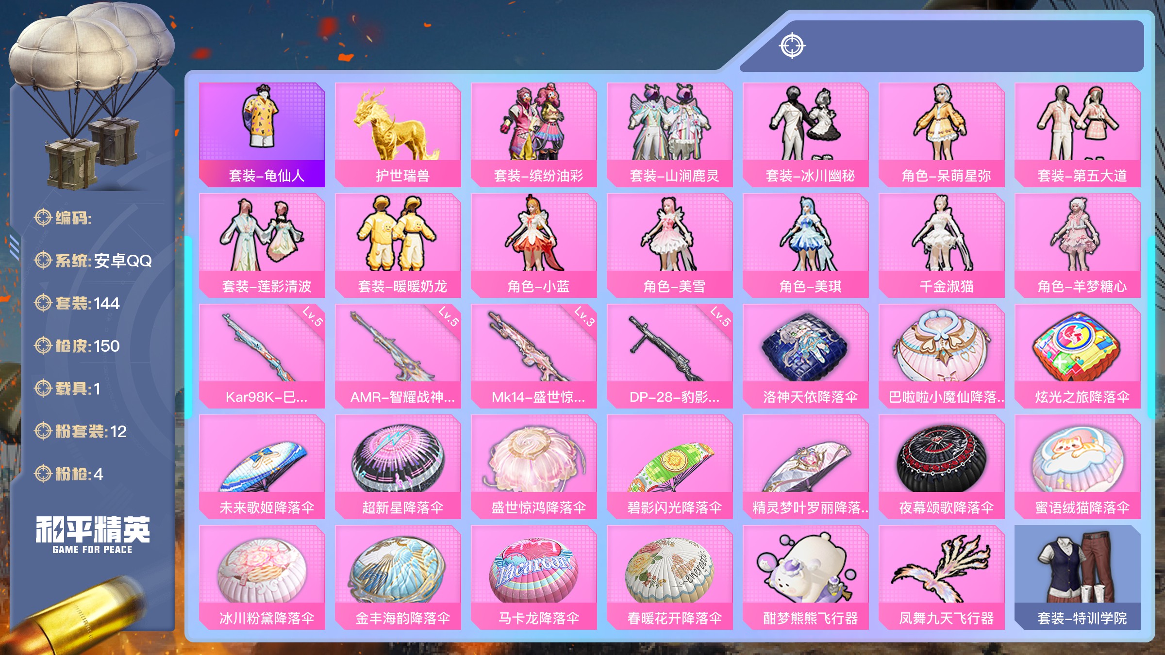 10粉装-6特效枪-0载具-4粉色飞行器-91646热力值-19王牌印记-212套装-285枪皮