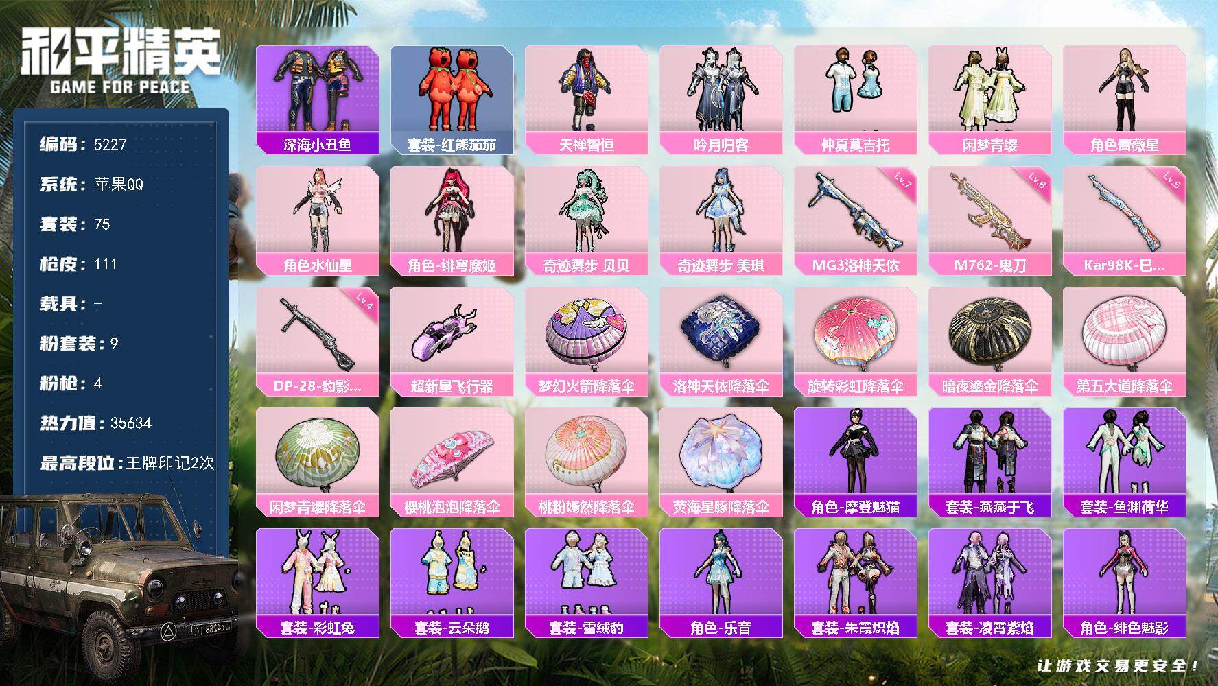 a4224/苹果QQ/热力值:57034,10粉装,3粉枪,2载具,10粉色战备,132套装,163