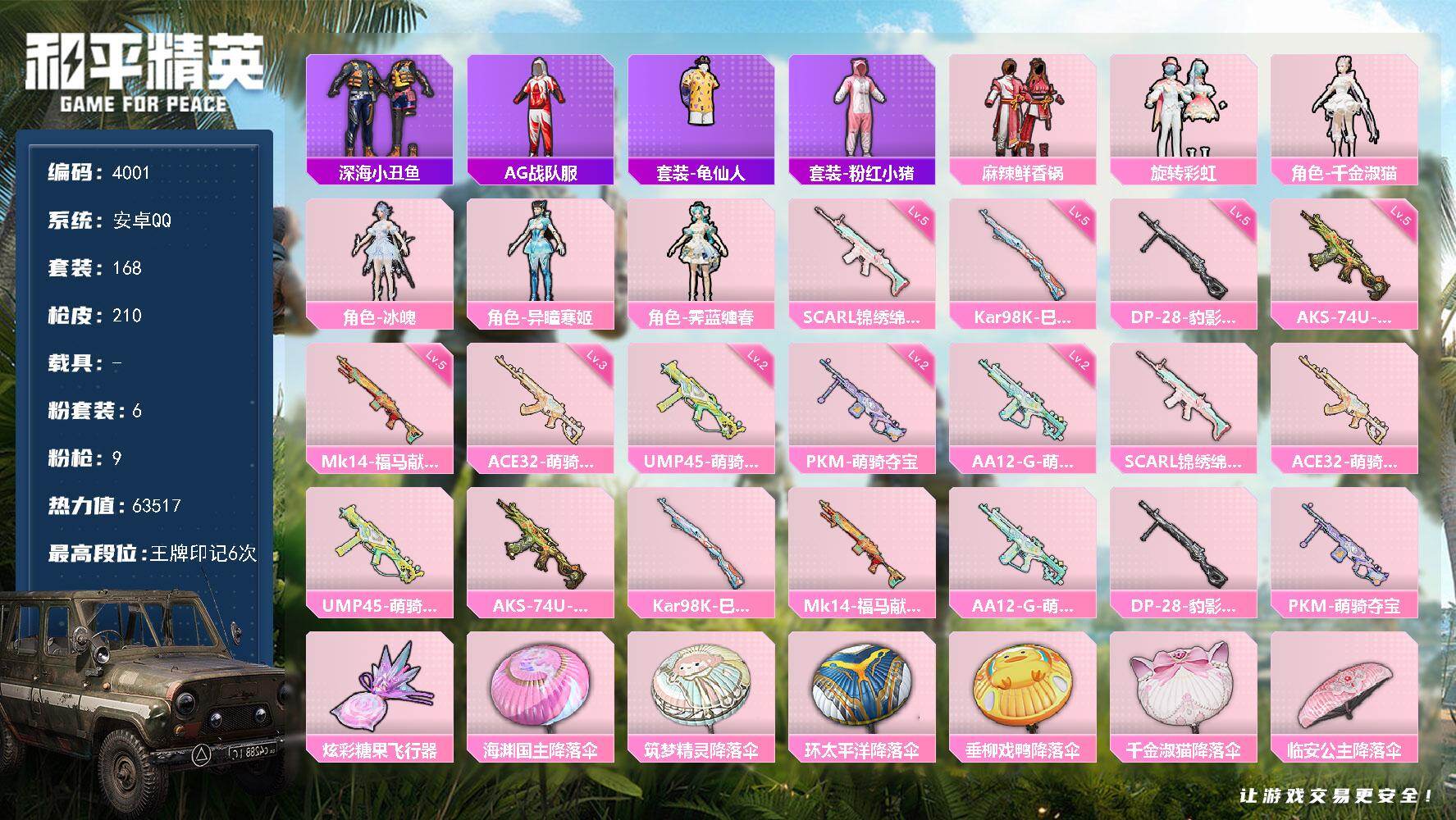 安卓 手Q-6粉装-9特效枪-0载具-2粉色飞行器-63517热力值-6王牌印记