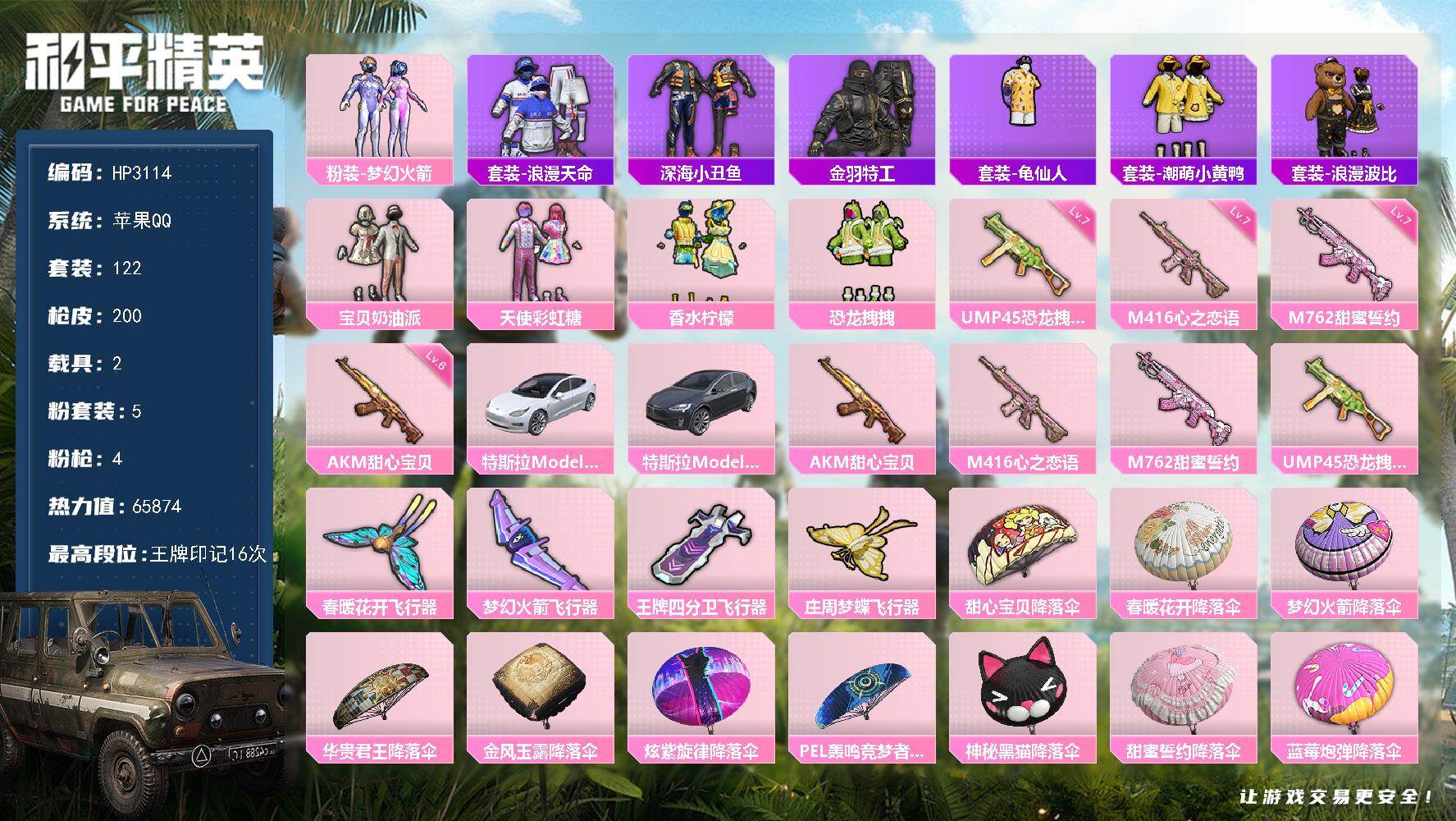 苹果 手Q-5粉装-4特效枪-2载具-4粉色飞行器-65874热力值-16王牌