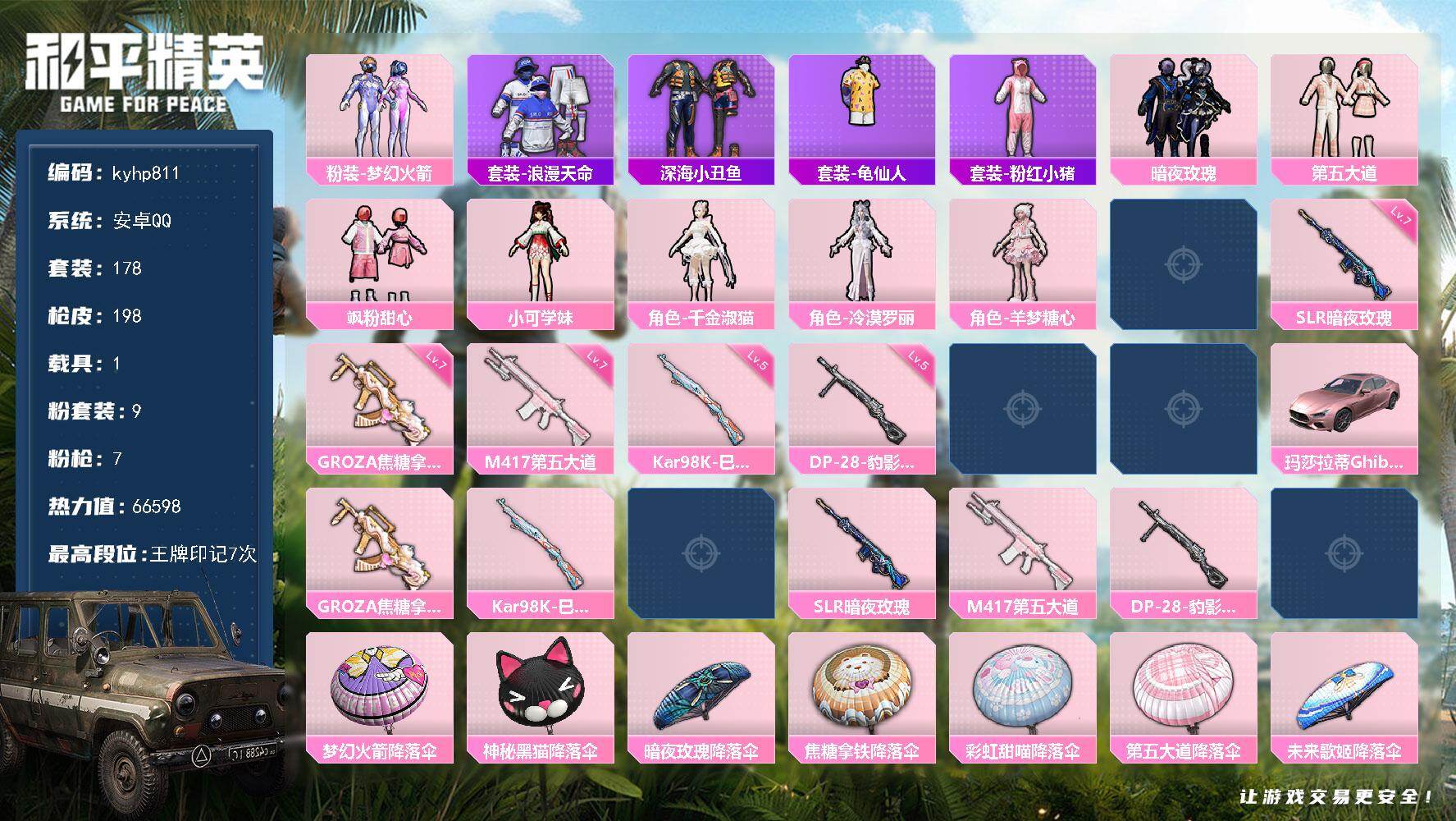 安卓 手Q-9粉装-7特效枪-1载具-0粉色飞行器-66598热力值-7王牌印