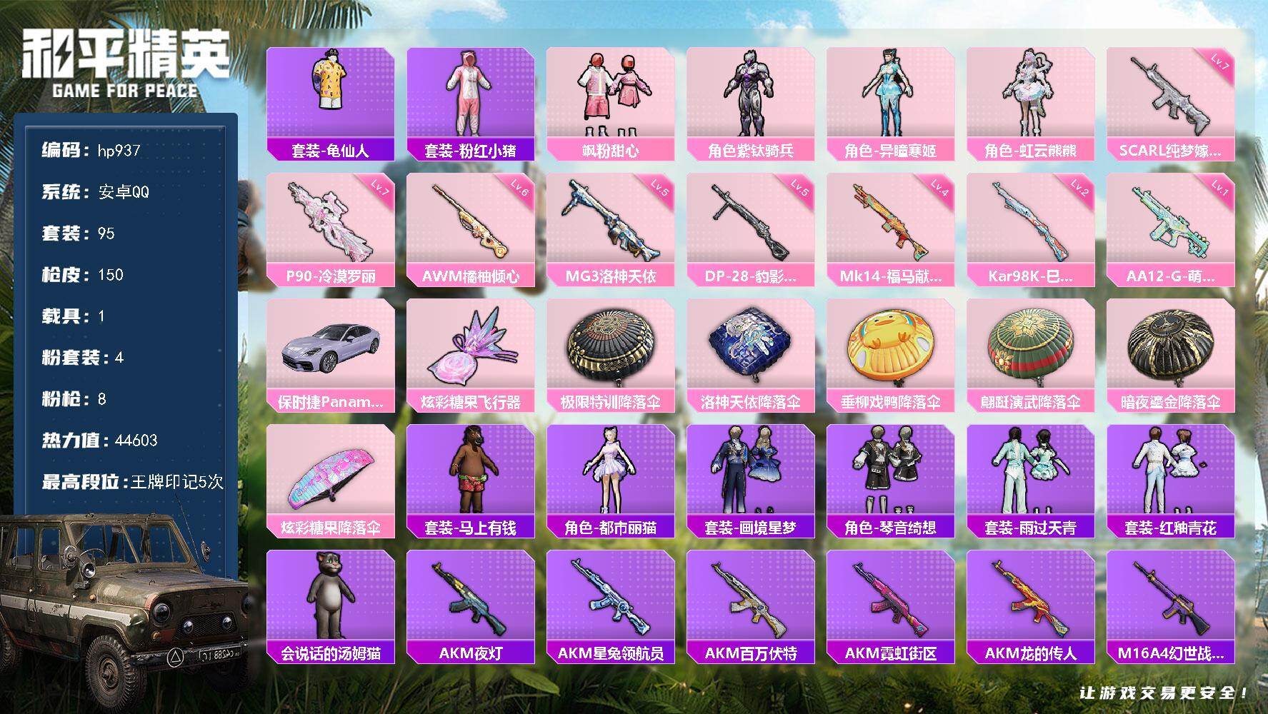 安卓 手Q-4粉装-8特效枪-1载具-1粉色飞行器-44603热力值-5王牌印