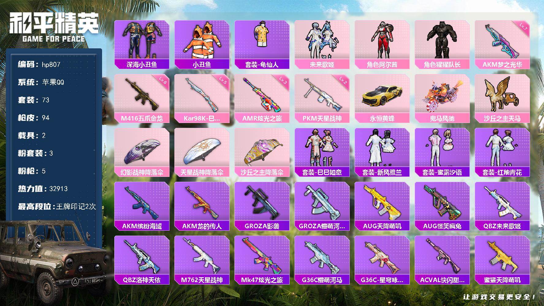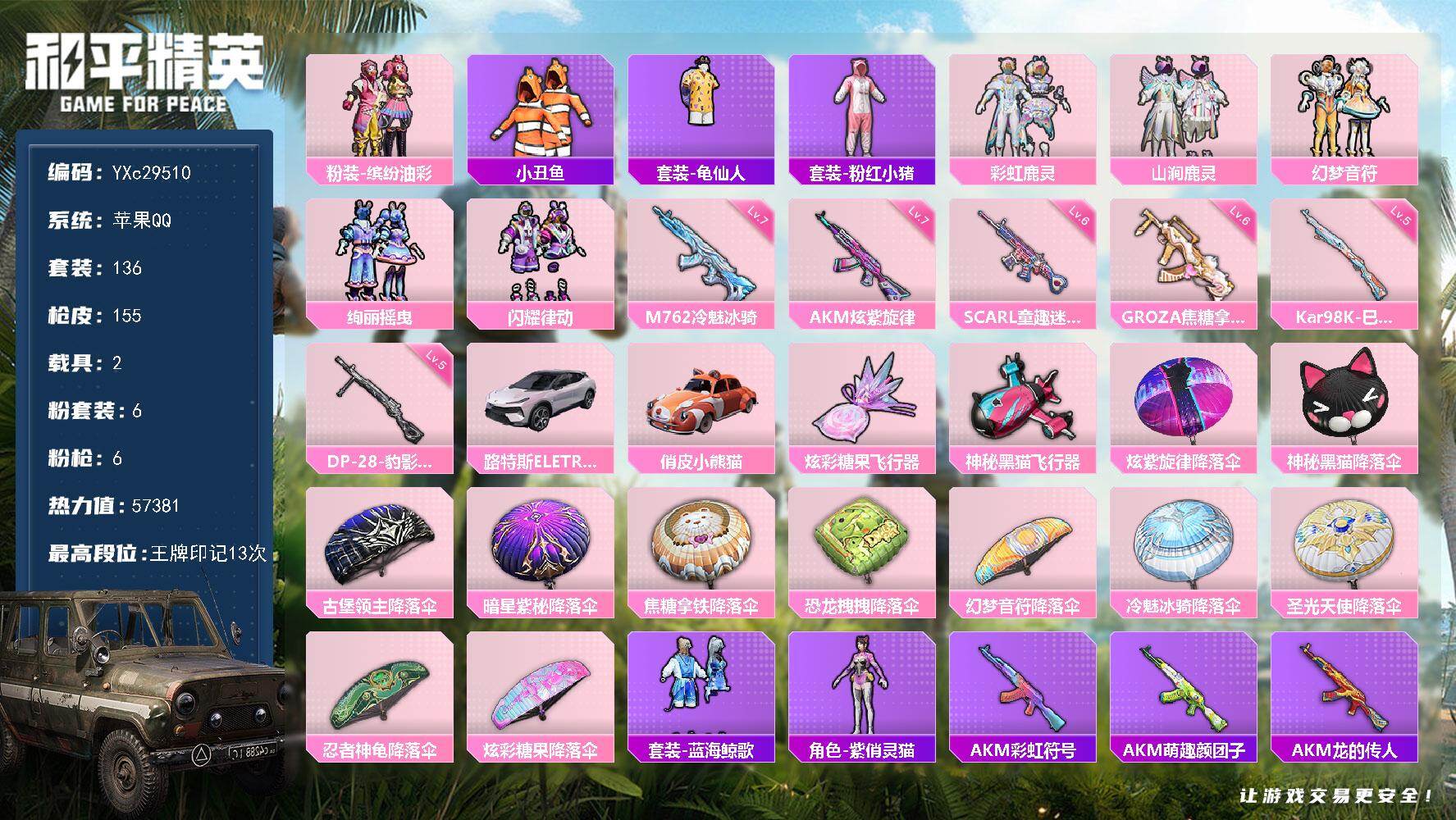 苹果 手Q-3粉装-5特效枪-2载具-1粉色飞行器-32913热力值-2王牌印
