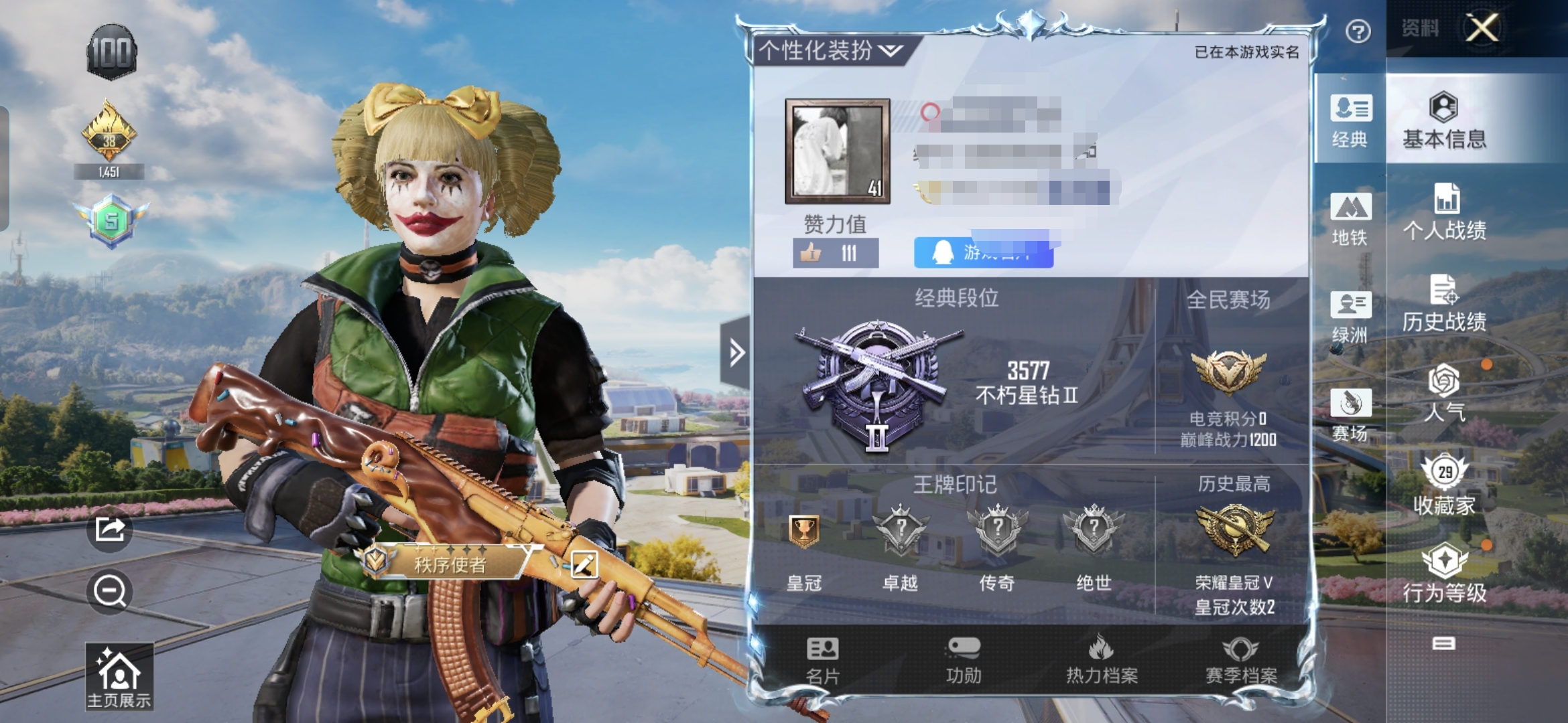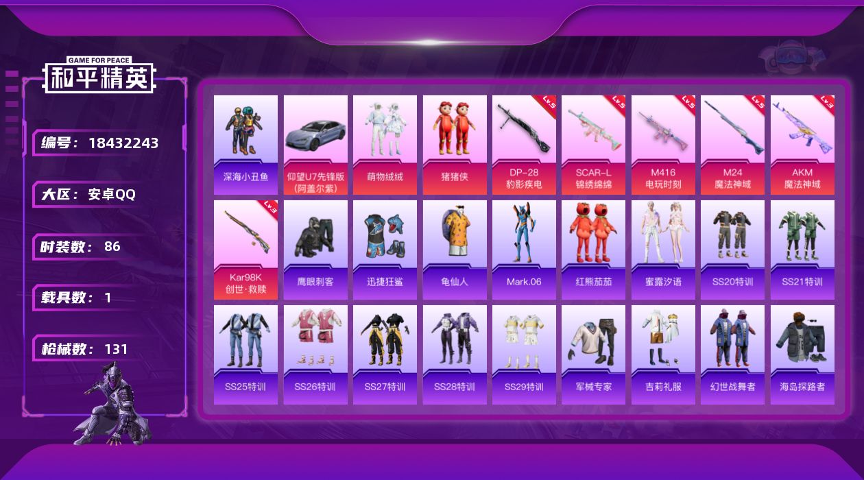 实名: 可修改 时装数: 44 枪械数: 94 战备数: 56 热门装扮: 天