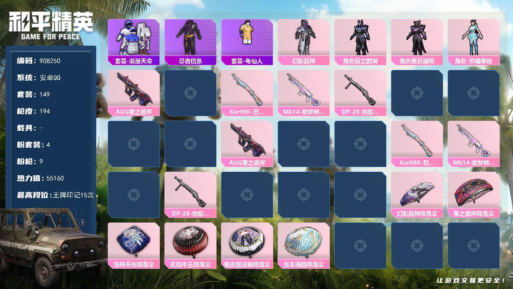4粉装-9特效枪-0载具-2粉色飞行器-55160热力值-15王牌印记-149套装-194枪皮