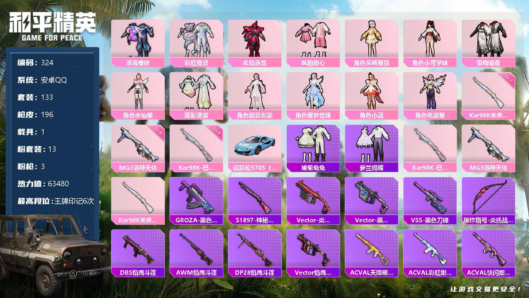 13粉装-3特效枪-1载具-63480热力值-6印记-133套装-196枪皮