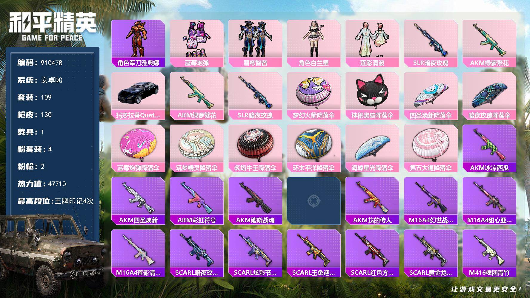 109套装/枪械2/载具1/王牌印记4/热力值47710/