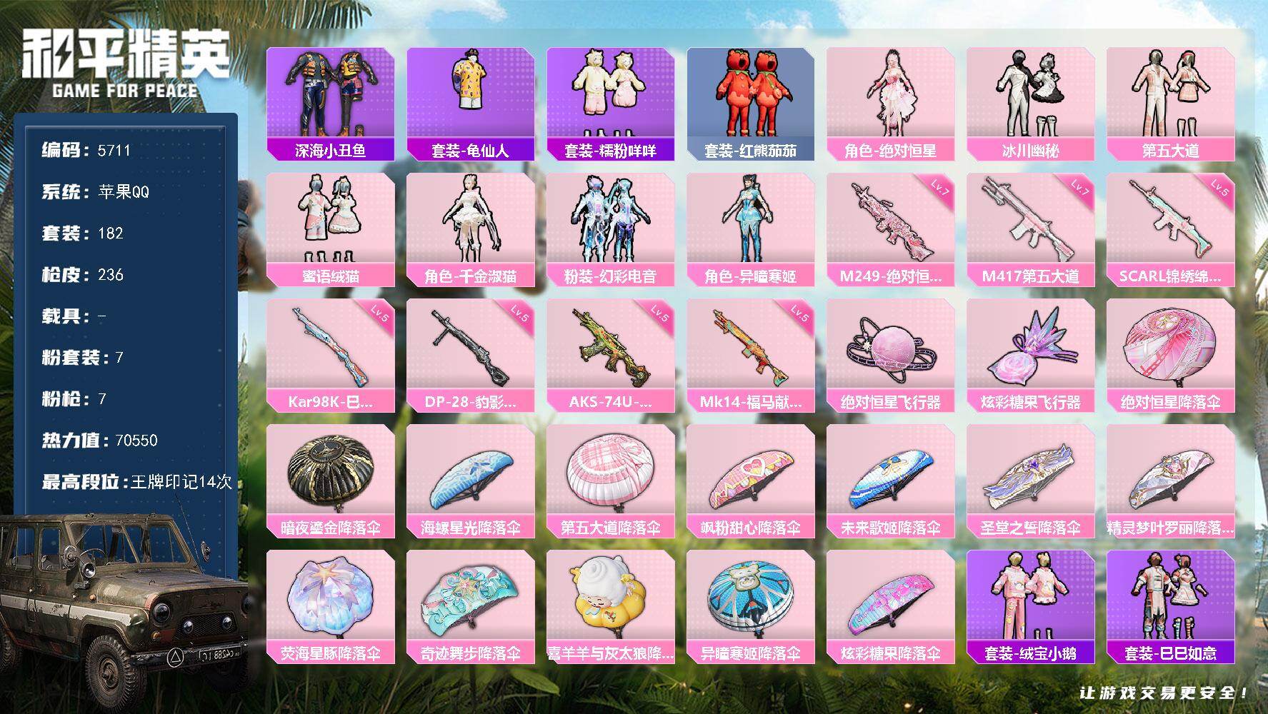 苹果 手Q-2粉装-5特效枪-2载具-2粉色飞行器-34254热力值-4王牌印记