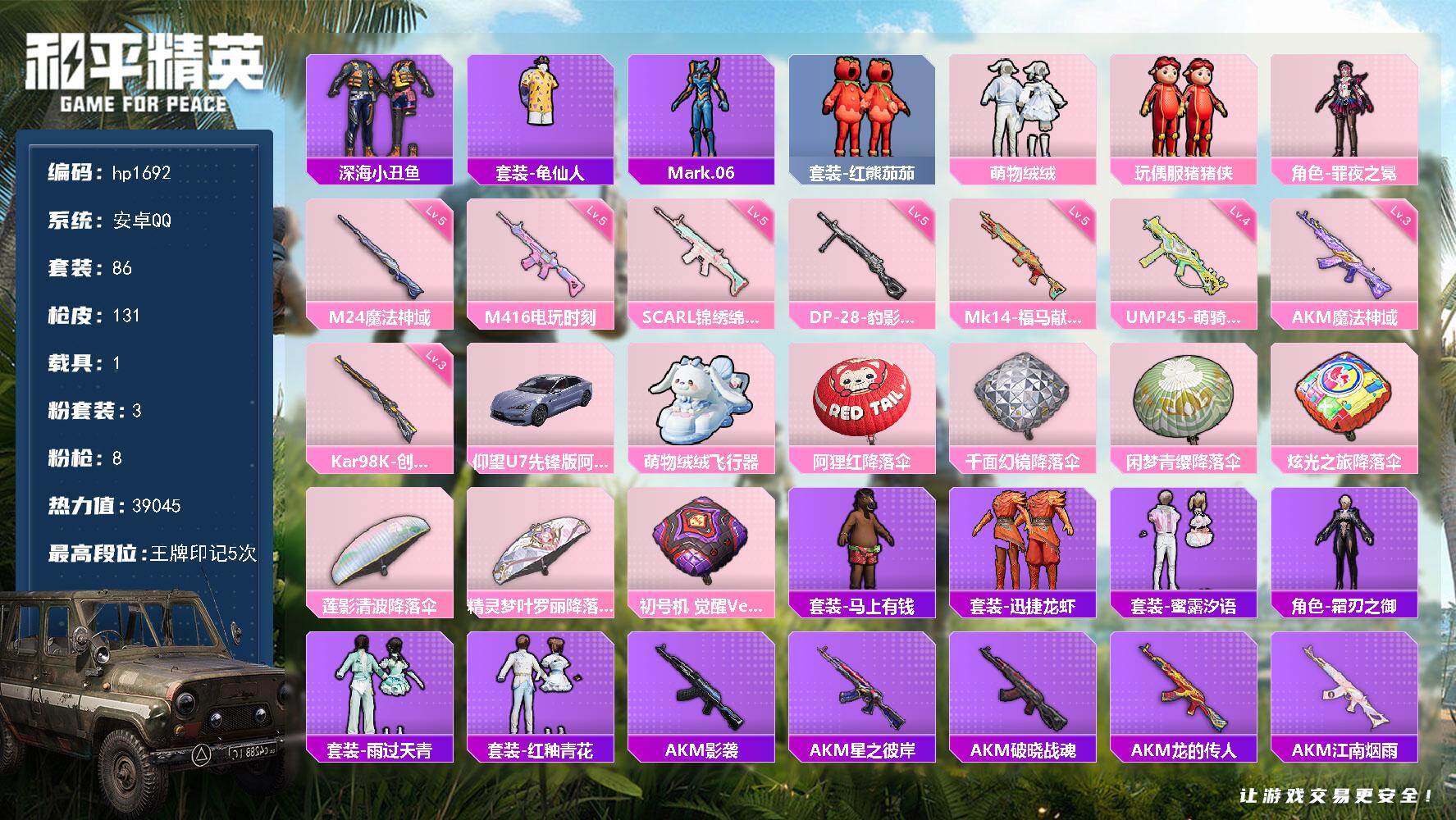 安卓 手Q-3粉装-8特效枪-1载具-1粉色飞行器-39045热力值-5王牌印记
