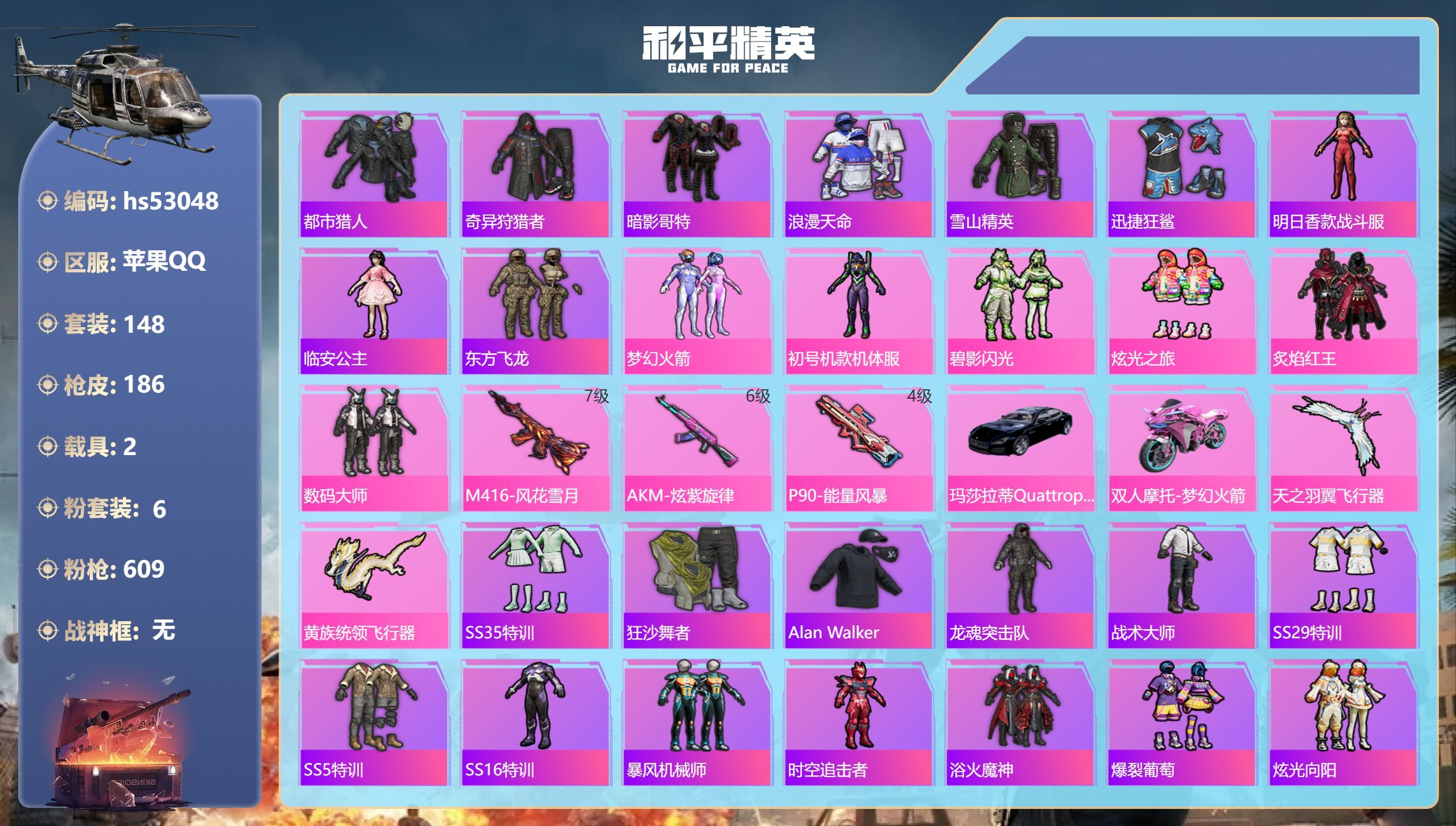 hs53048 苹果手Q-9王牌印记-6粉装-3特效枪-2载具-67195热力值-148套装-186