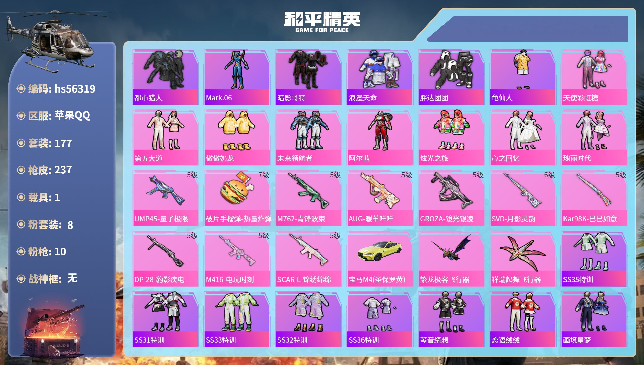hs56319 苹果手Q-14王牌印记-8粉装-10特效枪-1载具-76309热力值-177套装-2