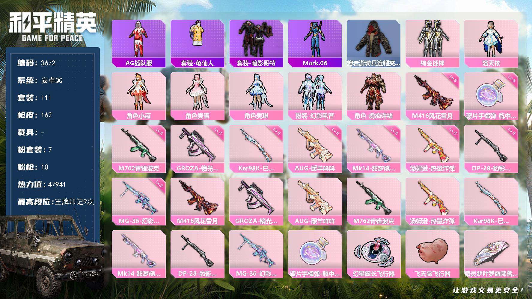 安卓 手Q-7粉装-10特效枪-0载具-3粉色飞行器-47941热力值-9王牌