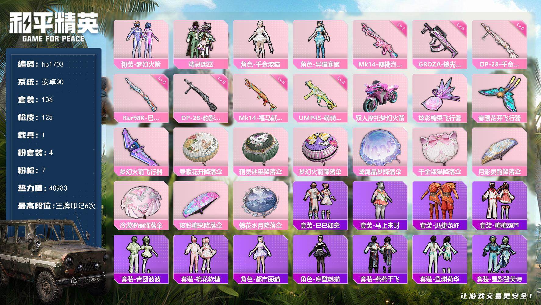 安卓 手Q-4粉装-7特效枪-1载具-3粉色飞行器-40983热力值-6王牌印记
