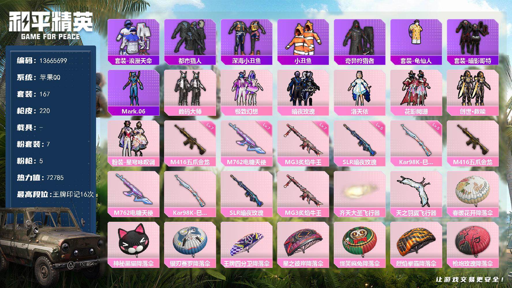 hs45290 苹果v-14王牌印记-11粉装-4特效枪-0载具-58802热力值-128套装-1