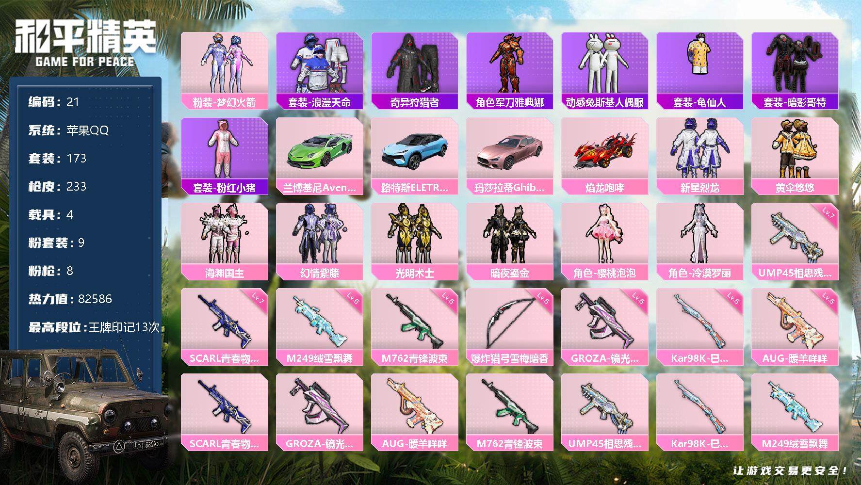 苹果 手Q-9粉装-8特效枪-4载具-5粉色飞行器-82586热力值-13王牌